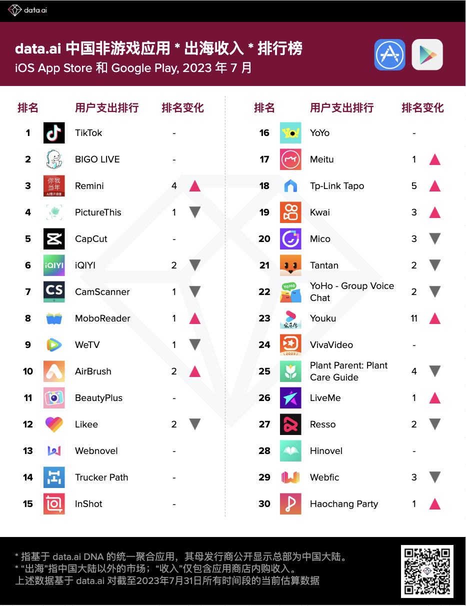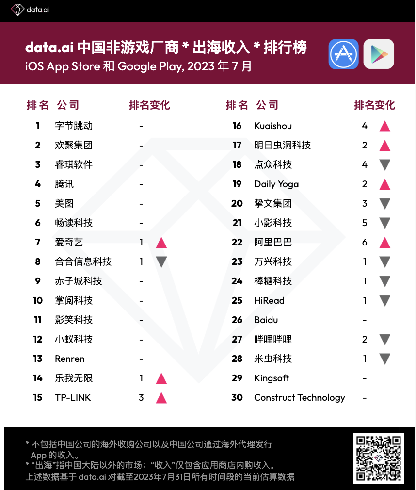 2023 年 7 月中国非游戏厂商及应用出海收入排行榜出炉,榜单前十较为稳定,仅爱奇艺上升1位来到第7。旗下在线视频应用 iQIYI 不久前顺利达成全球 3 亿美元用户支出里程碑,并在海外东南亚市场发挥稳定。其余排名增长明显的厂商包括 TP-LINK、Kuaishou 以及阿里巴巴。