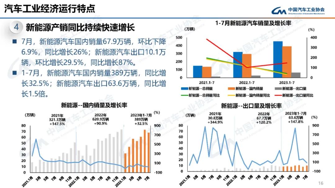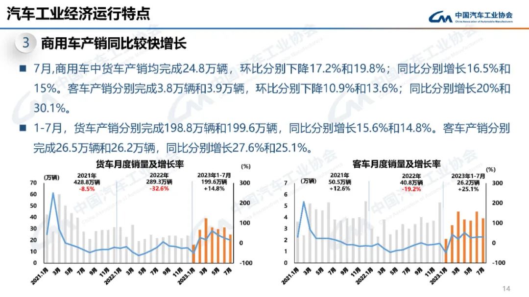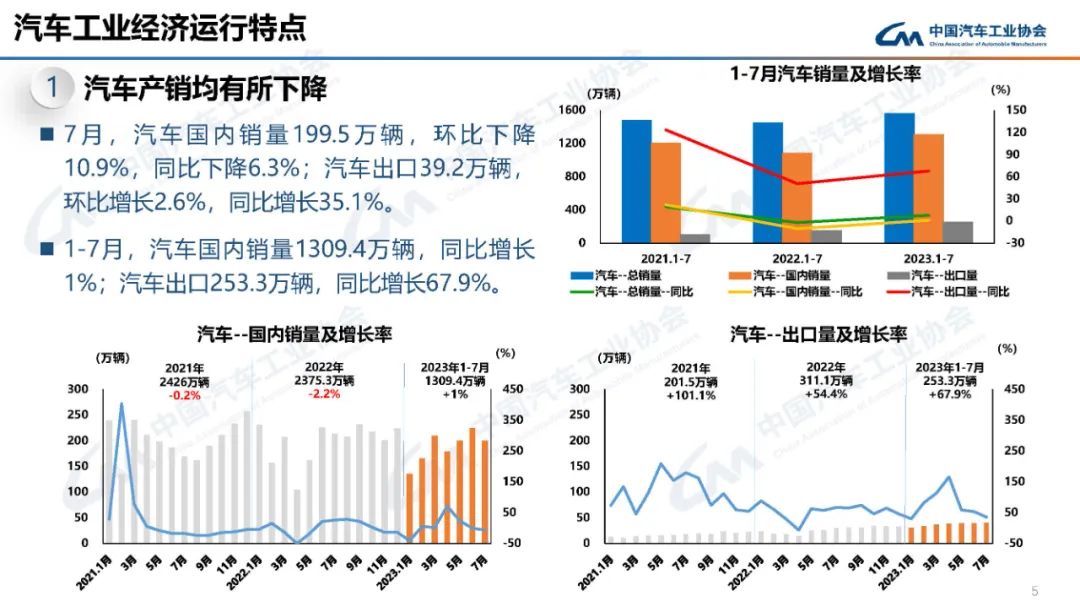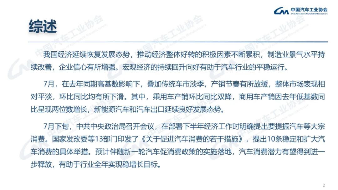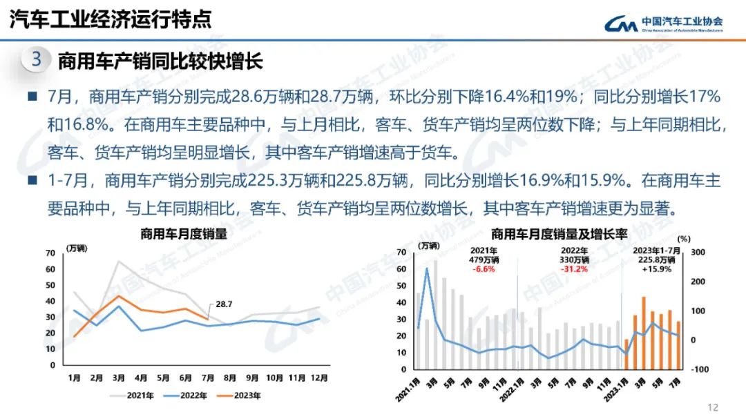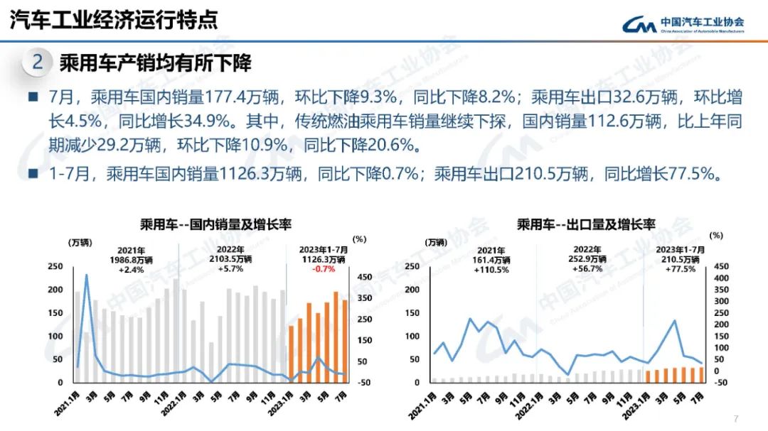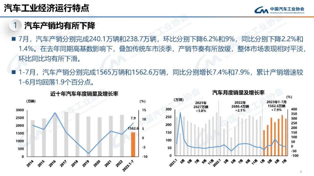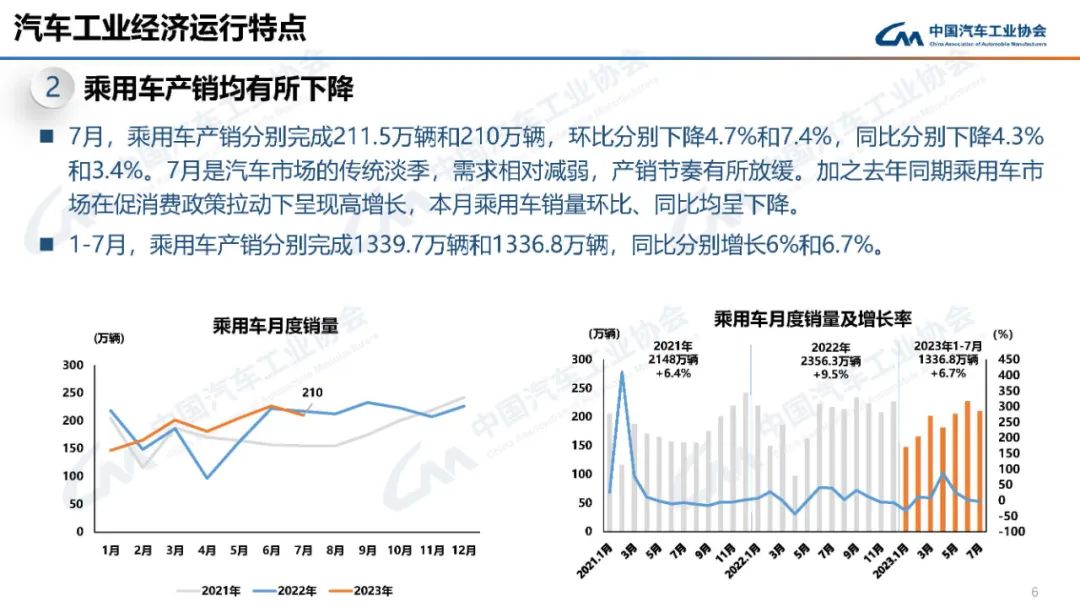 中国汽车工业协会:2023年7月汽车工业产销情况 7月,在去年同期高基数影响下,叠加传统车市淡季,产销节奏有所放缓,整体市场表现相对平淡,环比同比均有所下滑。其中,乘用车产销环比同比双降,商用车产销因去年低基数同比呈现两位数增长,新能源汽车和汽车出口延续良好发展态势。 更多阅读:中国汽车工业协会:2022年11月汽车工业产销情况中国汽车工业协会:2023年3月汽车工业产销情况中国汽车工业协会:2023年8月汽车工业产销情况中国汽车工业协会: 2023年5月汽车工业产销情况中国汽车工业协会:2022年汽车工业产销情况中国汽车工业协会:2023年1月汽车工业产销情况中国汽车工业协会:2022年10月中国汽车工业经济运行情况中国汽车工业协会:2024年10月汽车工业产销情况中国汽车工业协会:2021年9月中国汽车工业经济运行情况中国汽车工业协会:2024年6月汽车工业产销情况中国汽车工业协会:2023年6月汽车工业产销情况中国汽车工业协会:2021年2月中国汽车工业经济运行情况中国汽车工业协会:2020年11月汽车工业经济运行情况中国汽车工业协会:2023年2月汽车工业产销情况中国汽车工业协会:2023年5月汽车工业产销情况简析