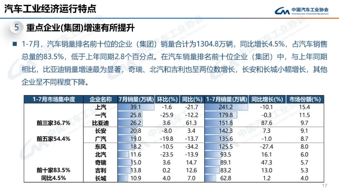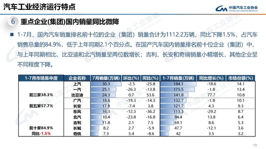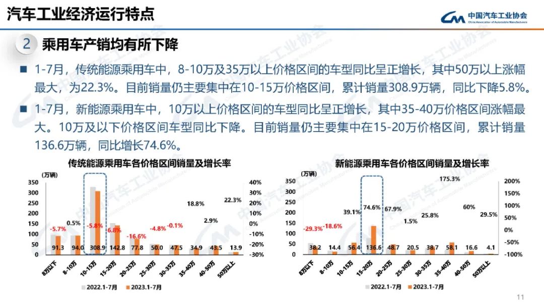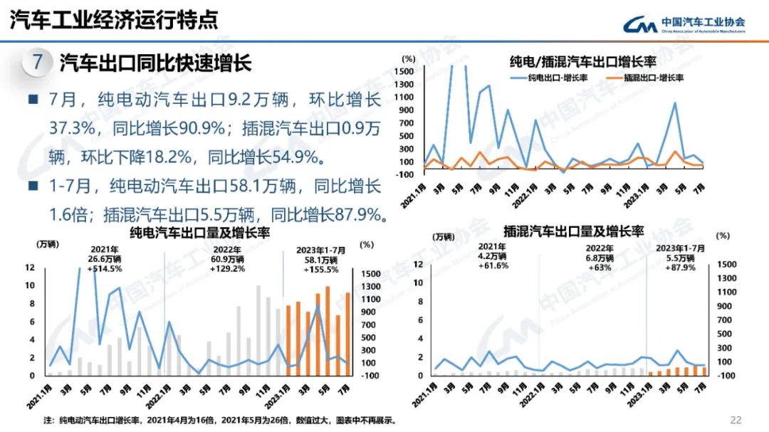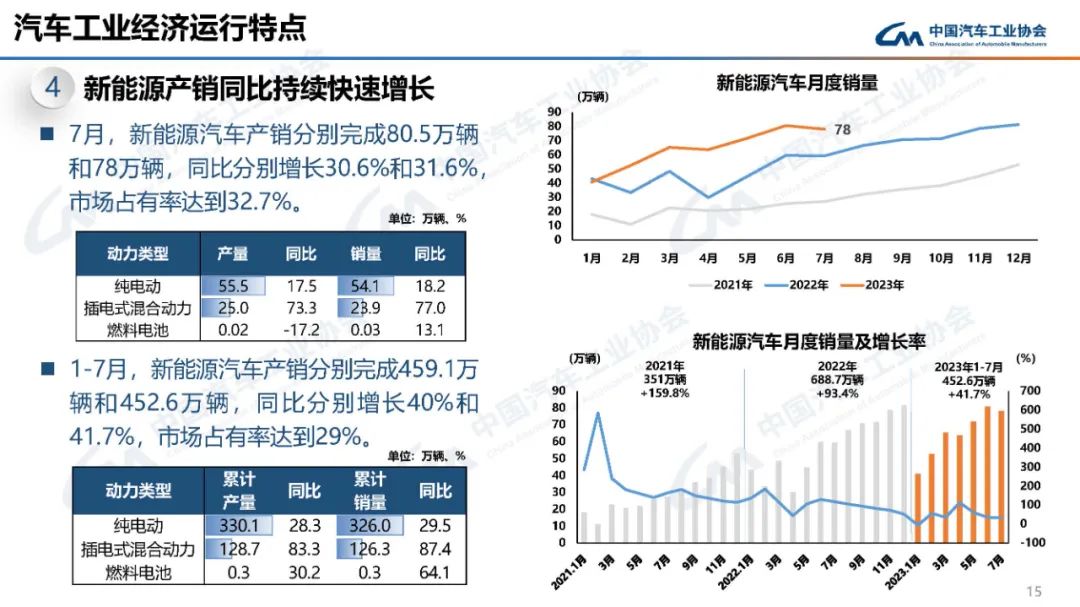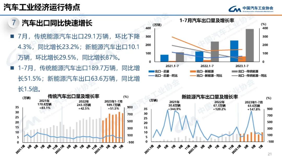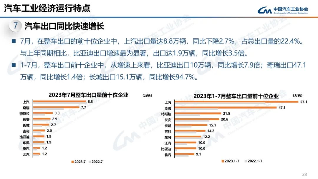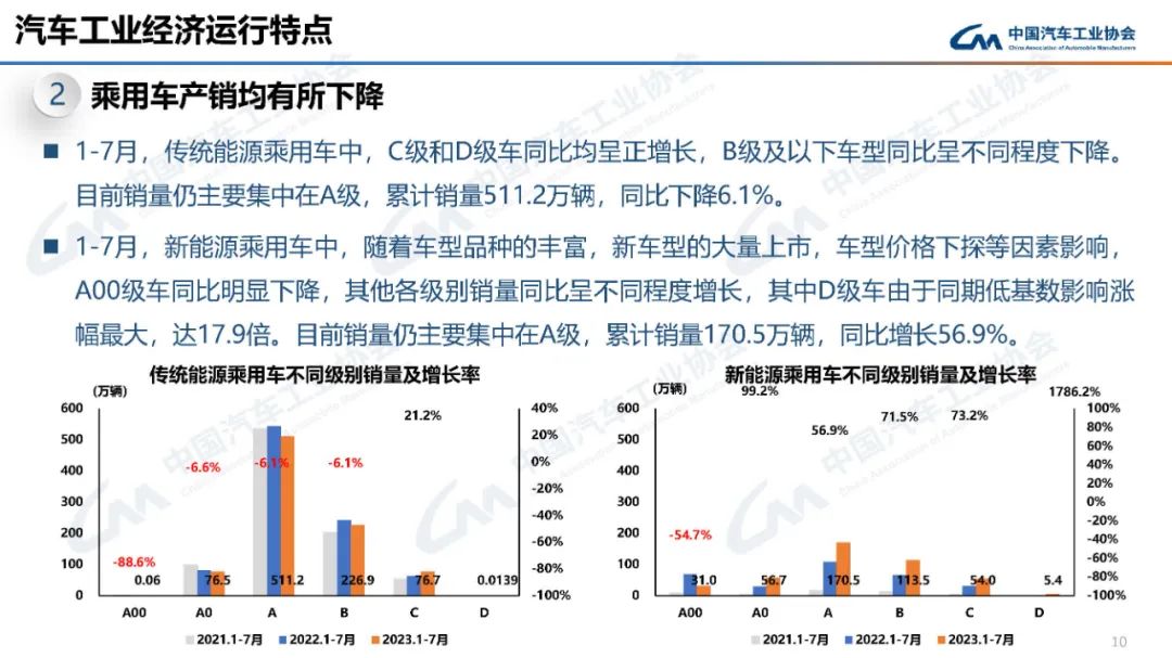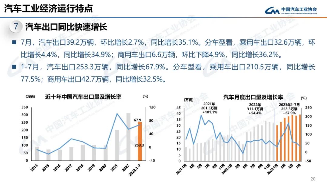 中国汽车工业协会:2023年7月汽车工业产销情况 7月,在去年同期高基数影响下,叠加传统车市淡季,产销节奏有所放缓,整体市场表现相对平淡,环比同比均有所下滑。其中,乘用车产销环比同比双降,商用车产销因去年低基数同比呈现两位数增长,新能源汽车和汽车出口延续良好发展态势。 更多阅读:中国汽车工业协会:2022年11月汽车工业产销情况中国汽车工业协会:2023年3月汽车工业产销情况中国汽车工业协会:2023年8月汽车工业产销情况中国汽车工业协会: 2023年5月汽车工业产销情况中国汽车工业协会:2022年汽车工业产销情况中国汽车工业协会:2023年1月汽车工业产销情况中国汽车工业协会:2022年10月中国汽车工业经济运行情况中国汽车工业协会:2024年10月汽车工业产销情况中国汽车工业协会:2021年9月中国汽车工业经济运行情况中国汽车工业协会:2024年6月汽车工业产销情况中国汽车工业协会:2023年6月汽车工业产销情况中国汽车工业协会:2021年2月中国汽车工业经济运行情况中国汽车工业协会:2020年11月汽车工业经济运行情况中国汽车工业协会:2023年2月汽车工业产销情况中国汽车工业协会:2023年5月汽车工业产销情况简析