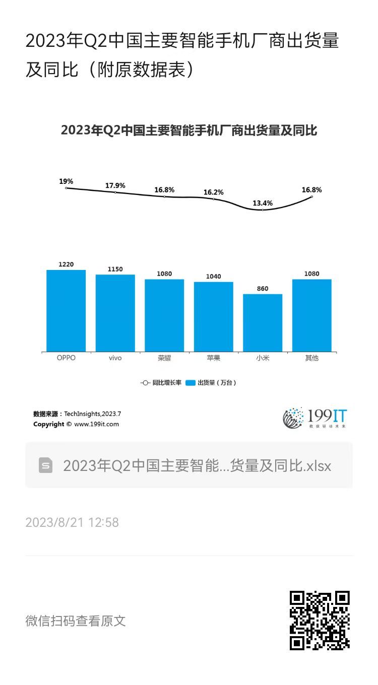 2023年Q2中国主要智能手机厂商出货量及同比(附原数据表) ​​​