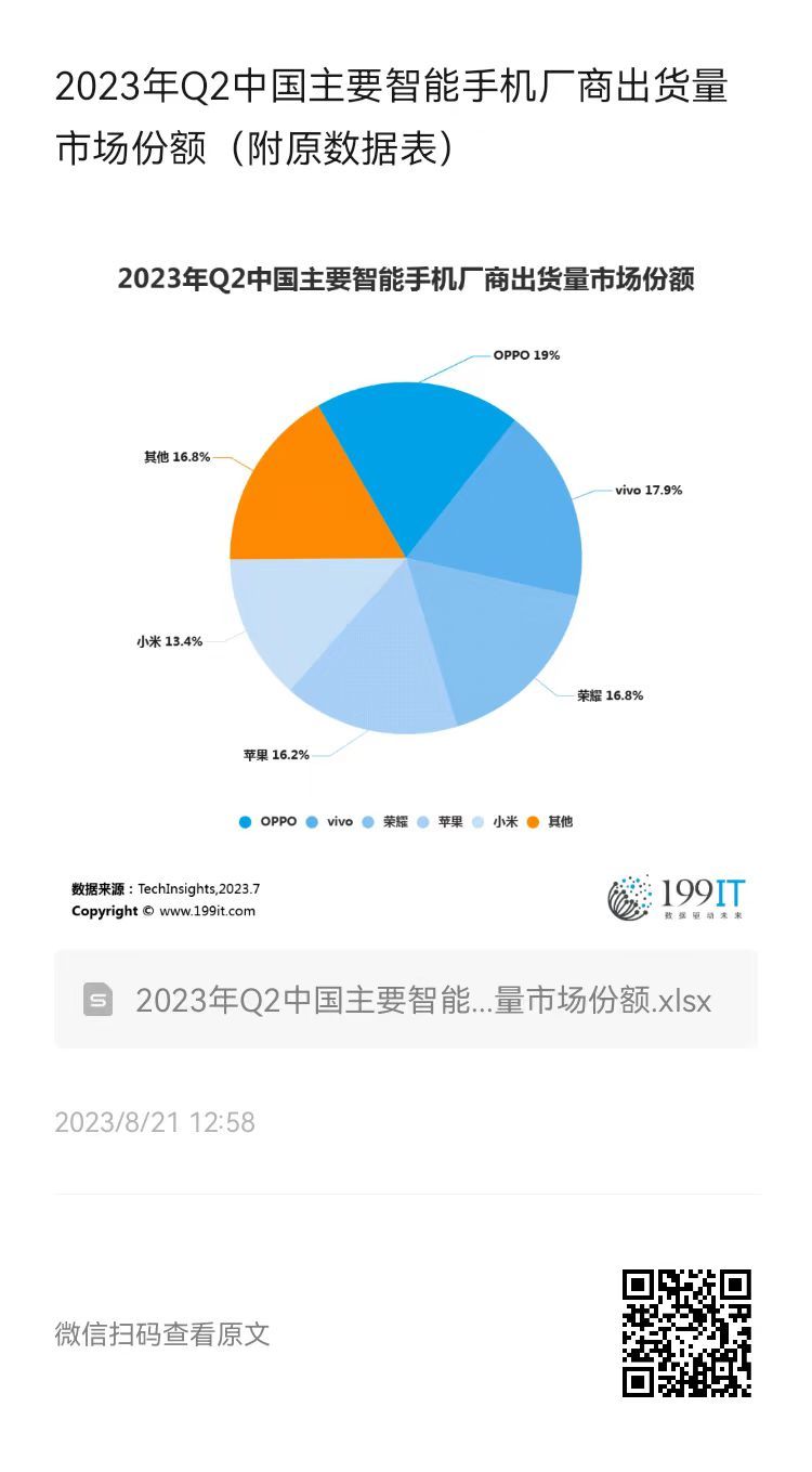 2023年Q2中国主要智能手机厂商出货量市场份额(附原数据表) ​​​