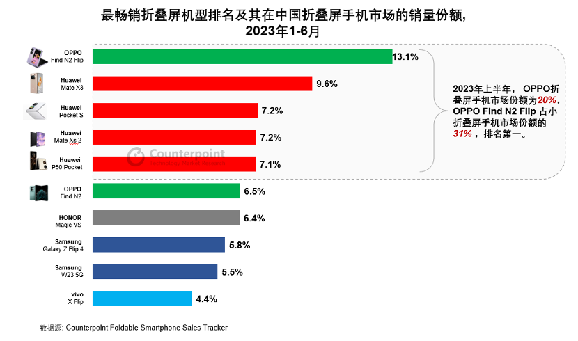OPPO Find N2 Flip(13.1%)、华为Mate X3(9.6%)、华为Pocket S(7.2%)、华为Mate Xs 2(7.2%)、华为P50 Pocket(7.1%)、OPPO Find N2(6.5%)、华为Magic VS(6.4%)、三星Galaxy Z Flip 4(5.8%)、三星W23 5G(5.5%)、vivo X Flip(4.4%)。