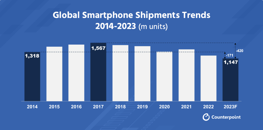 智能手机市场从未如此惨淡。根据Counterpoint Research的最新全球智能手机出货量初步数据预测,2023年全球智能手机出货量将下降6%,达11.5亿台,创过去十年来的最低水平。报告指出,各地区面临宏观问题,将智能手机的换机周期延长至创纪录水平。