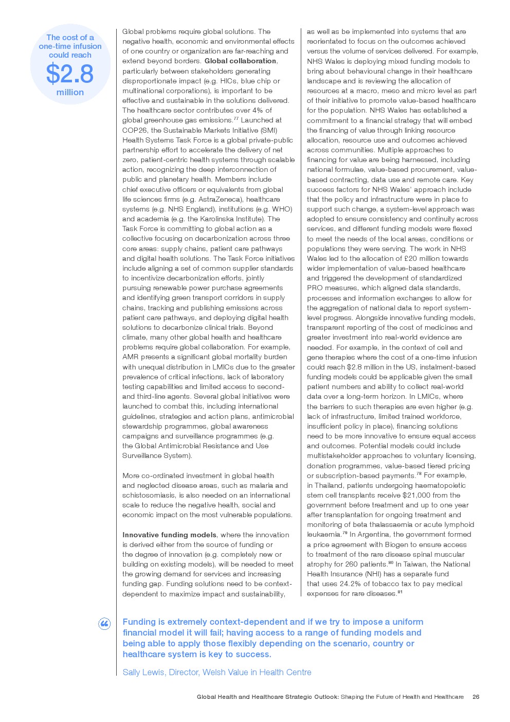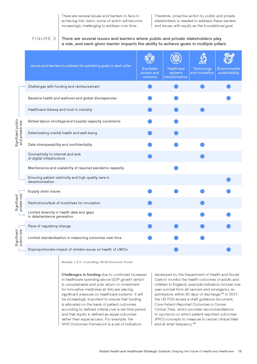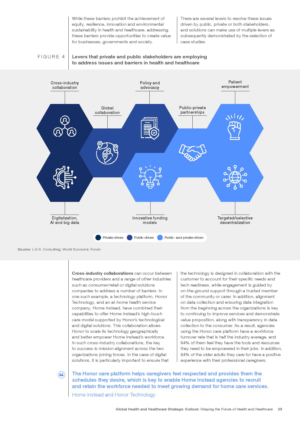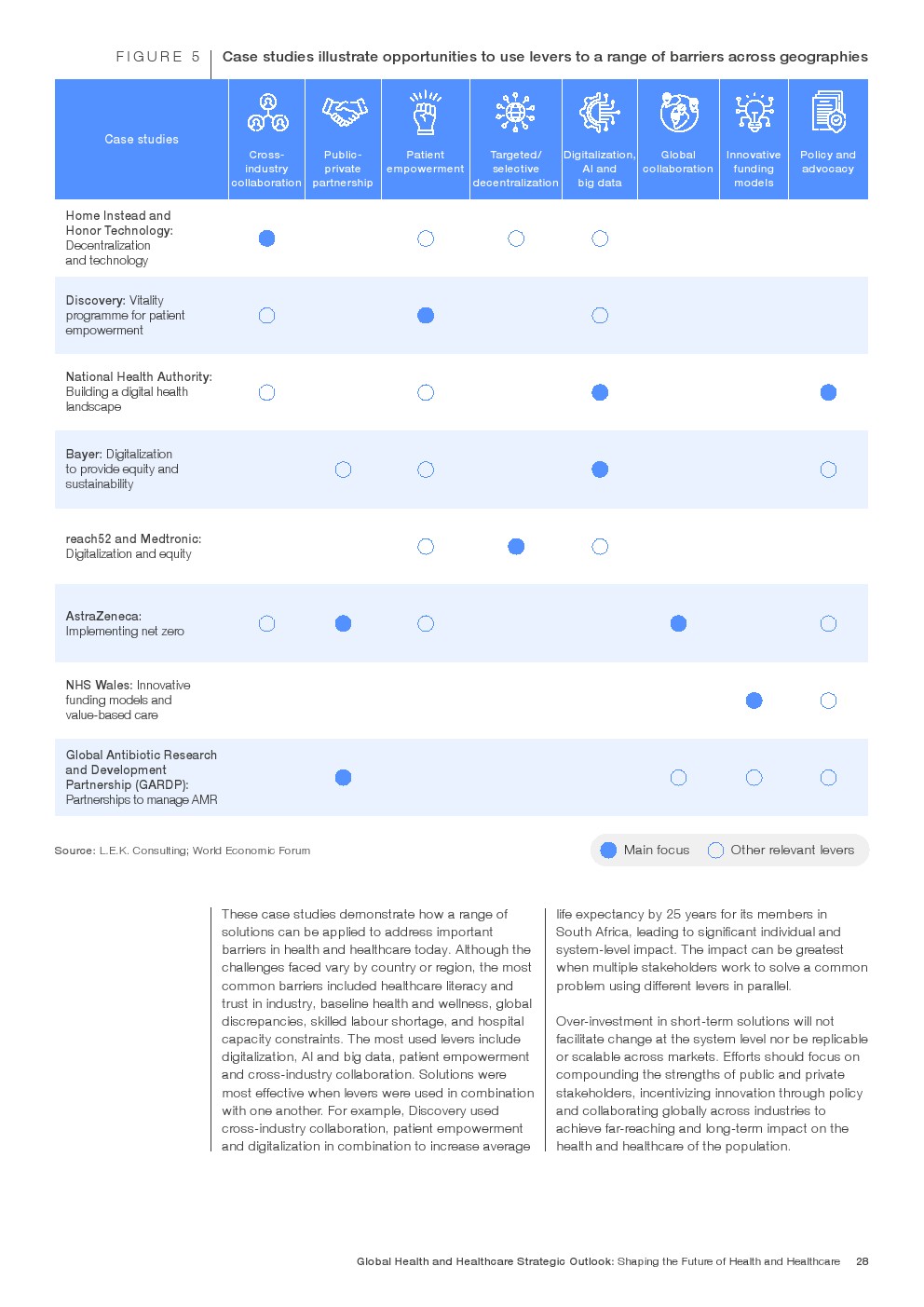 在努力实现这些战略的同时,公共和私营利益攸关方将遇到一些障碍。为了了解这些障碍的影响以及为解决这些障碍而部署的解决方案,报告对全球八个案例进行了研究。虽然每个案例研究都面临着微妙的障碍。对全球健康差距扩大的担忧十分突出。健康和医疗保健行业的创新速度受到监管改革步伐缓慢的限制。虽然在转变,但需要更大的协作来改变现状,从孤立的工作到基于共同目标的协作,这些共同目标提供的结果大于其各部分的总和。这些合作都不会产生长期的影响,除非在系统级别上驱动变化,而目前对系统级别的支持、激励或监控是有限的。
