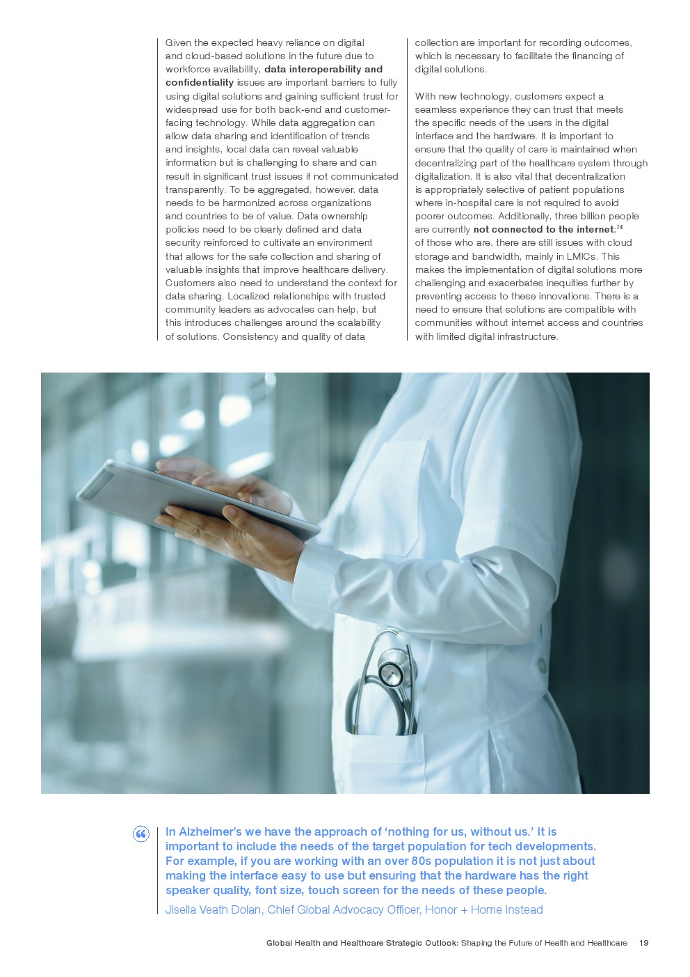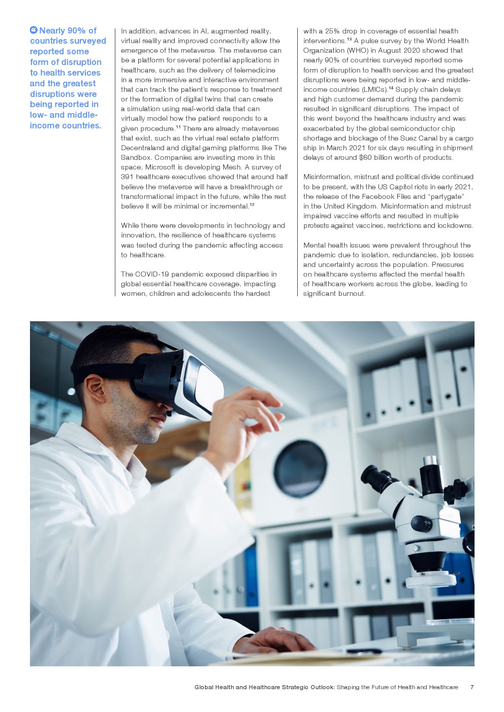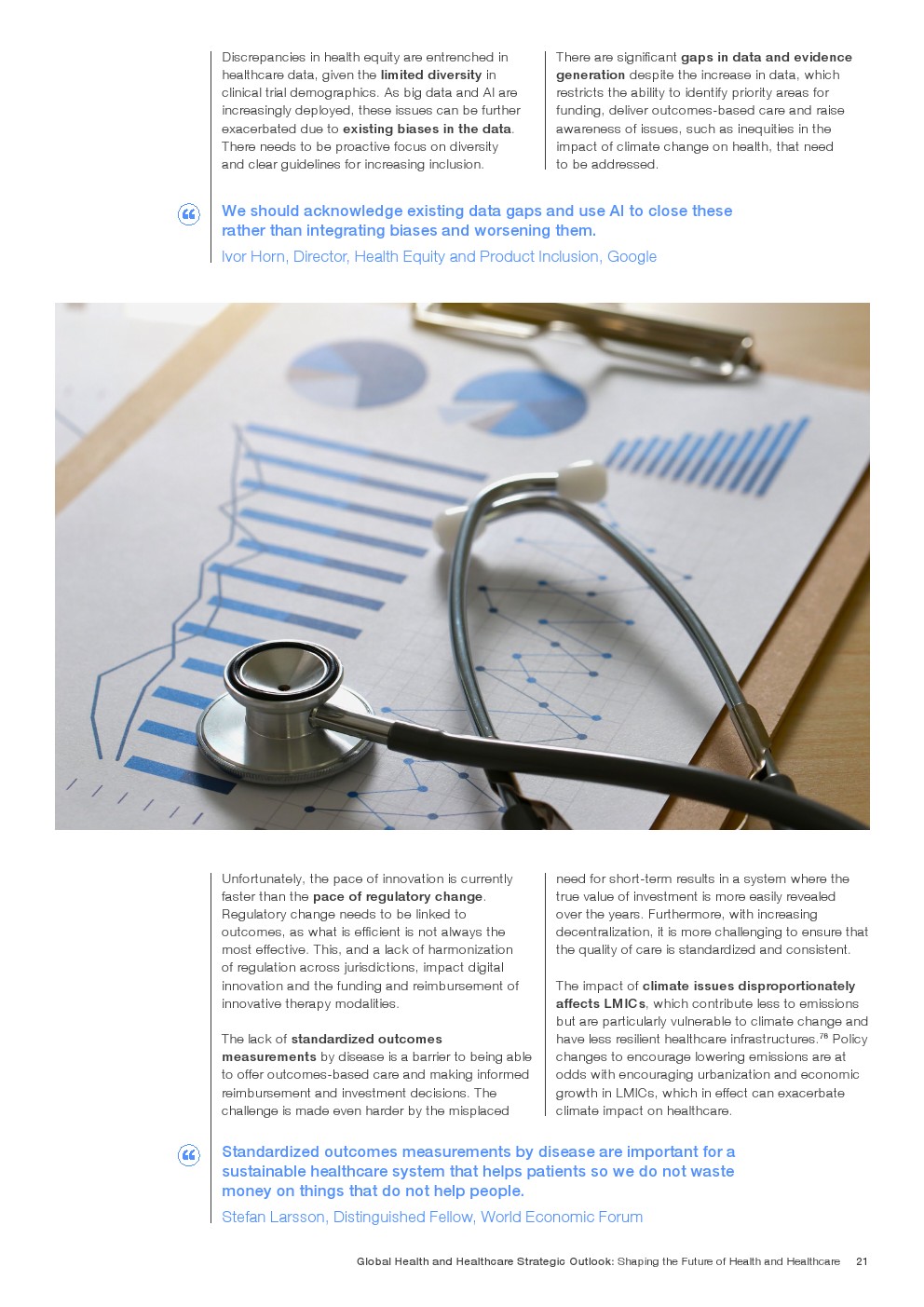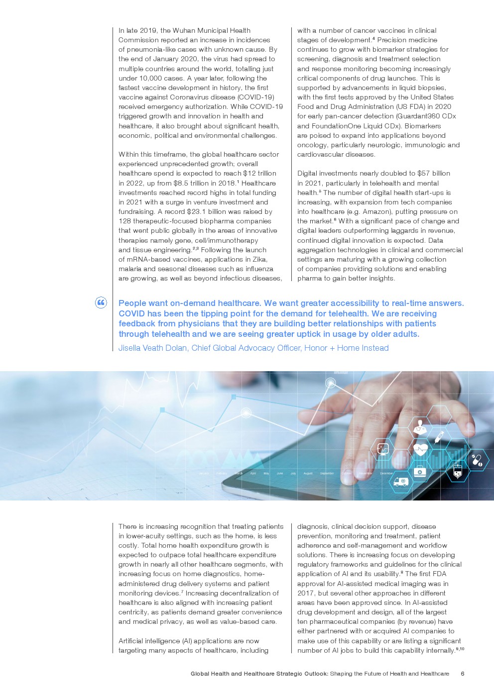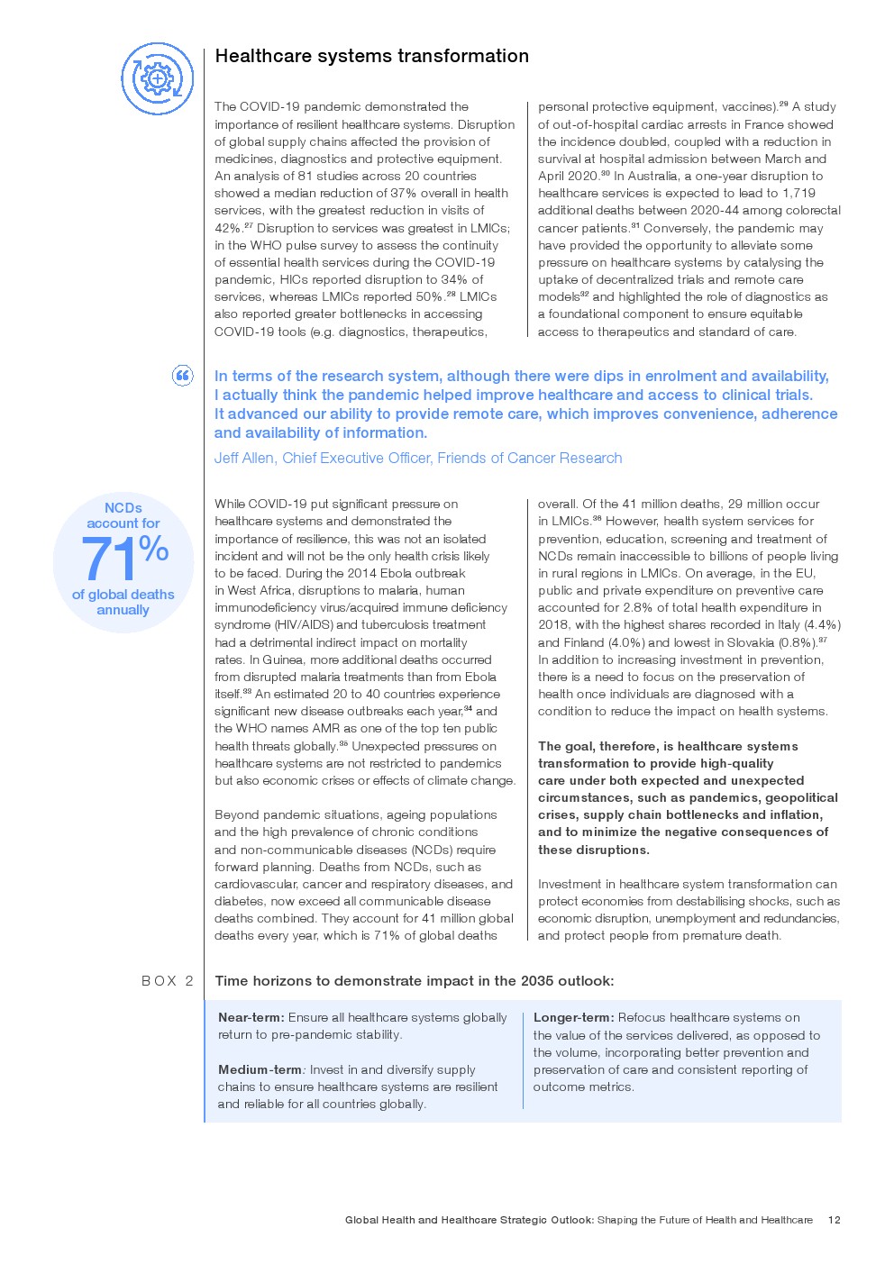 在努力实现这些战略的同时,公共和私营利益攸关方将遇到一些障碍。为了了解这些障碍的影响以及为解决这些障碍而部署的解决方案,报告对全球八个案例进行了研究。虽然每个案例研究都面临着微妙的障碍。对全球健康差距扩大的担忧十分突出。健康和医疗保健行业的创新速度受到监管改革步伐缓慢的限制。虽然在转变,但需要更大的协作来改变现状,从孤立的工作到基于共同目标的协作,这些共同目标提供的结果大于其各部分的总和。这些合作都不会产生长期的影响,除非在系统级别上驱动变化,而目前对系统级别的支持、激励或监控是有限的。