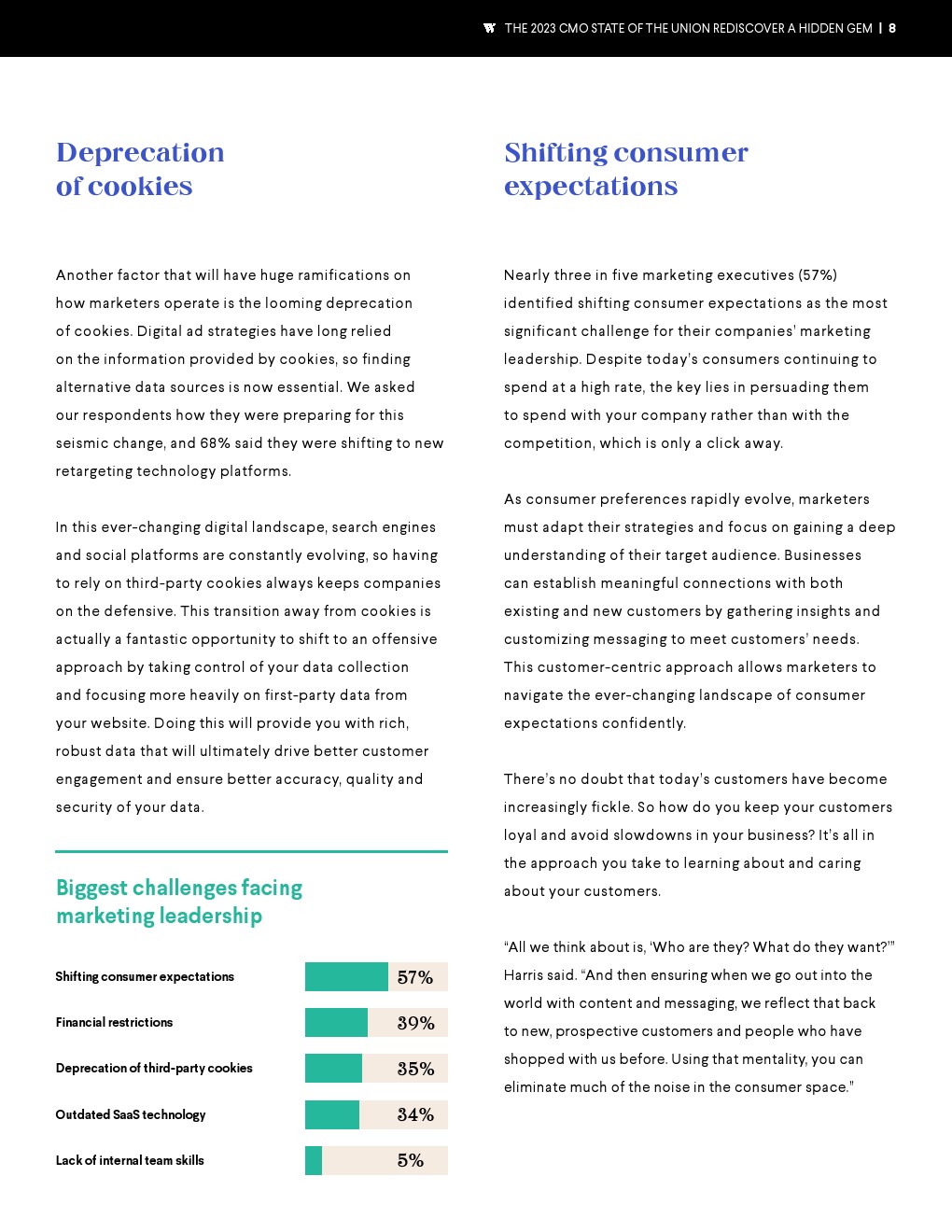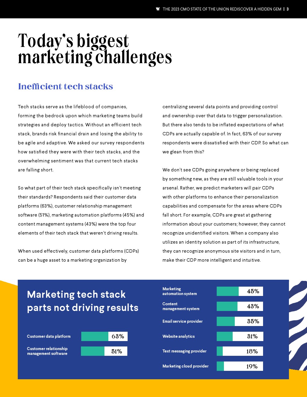 有趣的是,首席营销官表示将削减预算的领域是营销技术。尽管整个行业都面临着削减成本的压力,但某些平台未能推动业绩。63%的CMO表示他们的客户数据平台(CDP)不符合标准,51%的受访者表示他们的客户关系管理(CRM)软件也是如此。