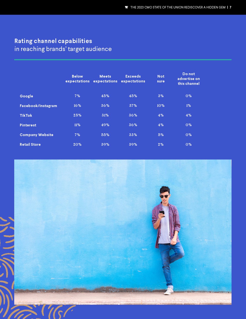 Facebook和Instagram的元属性也非常有效,37%的受访者表示这些平台超出了预期,另有36%的CMO认为它们达到了预期。虽然36%的CMO表示TikTok超出了预期,但有相多的人(25%)认为在接触目标受众方面该平台低于预期。