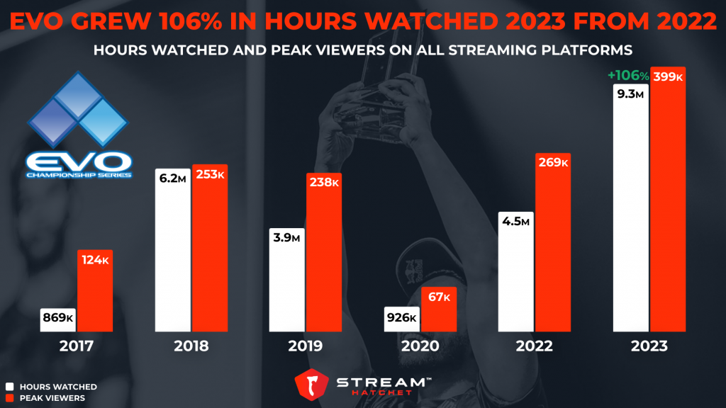 今年的EVO赛事的观看时间比2022年增长了106%,比2017年增长了972%。该活动也创下了有史以来的最高收视率,观众人数超过39.9万人。这也是整个直播平台上格斗游戏类型在2023年的最高收视高峰。