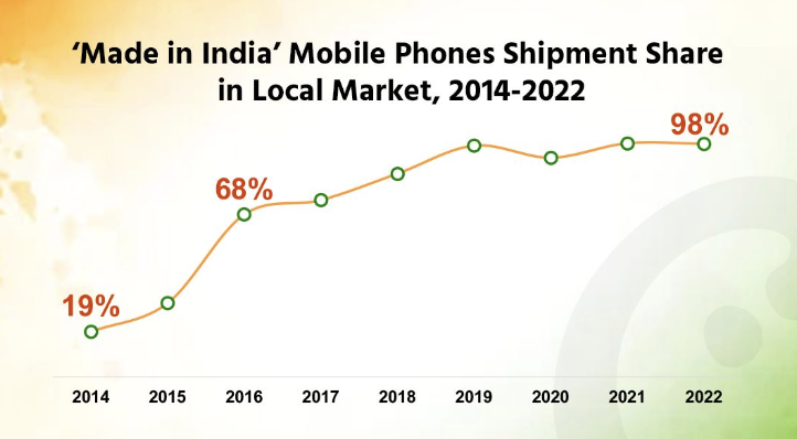 2022年,印度整体手机市场出货量的98%以上由“印度制造”,而现任政府在2014年上台时,印度本地制造的手机仅占市场的19%。“
