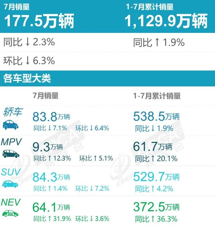 据中国汽车流通协会汽车市场研究分会(乘联会)最新零售销量数据统计,7月份国内狭义乘用车市场零售销量达177.5万辆,同比下降2.3%,环比下降6.3%;1-7月份累计销量1,129.9万辆,同比增长1.9%。