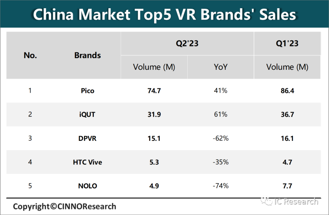02、爱奇艺奇遇(iQUT)Q2’23表现强劲,销量同比增长61%,位列行业第二。借助爱奇艺平台,奇遇在内容生态的技术和资源方面具有得天独厚的优势。今年3月与京东宣布合作,从而带动奇遇VR线上销量。MIX VR一体机今年1月上市,价格是3,499元,截至到6月份底,单款销量突破1.8万台,仅次于Pico 4 pro。