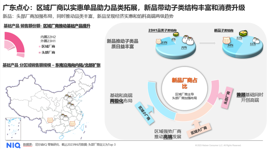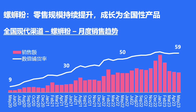细分子类来看,速食产品多样化趋势明显,地域性美食产品表现突出。例如急冻广东点心和螺狮粉在2023上半年实现高速增长,同比增幅分别为+43.7%和+28.9%。NIQ零售监测数据显示,近三年来螺蛳粉在全国现代渠道的月度铺货率和销售规模持续增长,消费从区域逐渐走向全国。全国性拓展背后的驱动力是持续高涨的消费者需求和厂商的不懈努力,数据显示,2020年5月,螺蛳粉的核心市场聚焦在广东、广西和四川三个省份,2023年5月已成长为全国性消费产品。