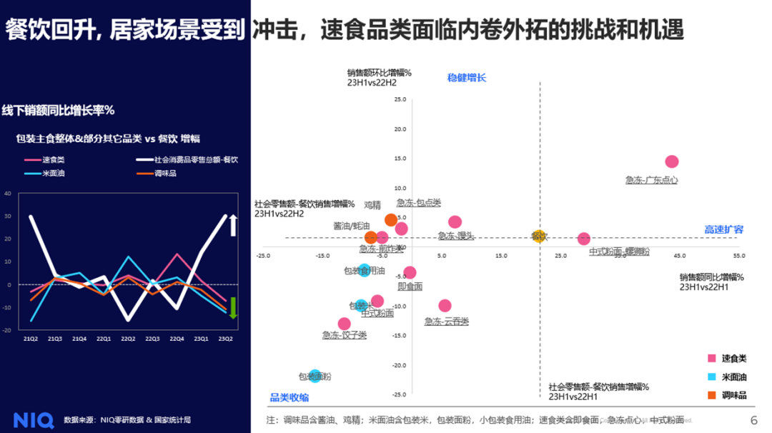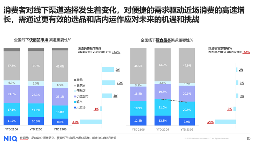 与此同时,速食消费者对线下渠道的选择也发生明显变化,满足消费者便捷需求的近场化渠道受到青睐,如食杂店、便利店和小超市均有小幅增长,同比增幅分别为+2%、+3%、+3%,小超市和食杂店对于品类的重要性高且规模保持增长,值得优先关注。