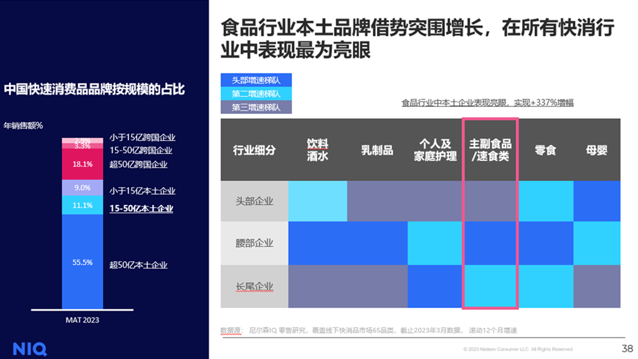 国家统计局公开数据显示,食品烟酒作为民生基础在居民总支出中占比排名第一,占总支出的31%。同时食品烟酒的消费支出保持稳定增长,近十年来年度复合增长率达+7%。今年上半年,在医疗保健、教育娱乐支出增长显著的背景下,食品烟酒支出同比仍然保持了+6%的增长,体现了居民对于食品烟酒的稳定需求。尼尔森IQ数据指出,食品行业内中小规模的本土品牌借势突围,在整体快消行业中小品牌里的增幅最为亮眼,值得关注。
