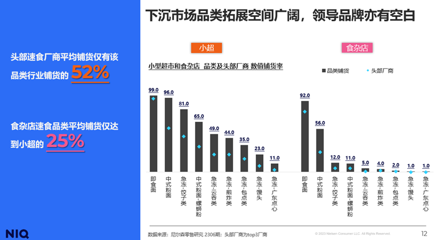 在零售业态越来越靠近消费者的今天,下沉渠道速食品类和厂商的渗透率仍存在提升空间,据尼尔森IQ数据显示,全国食杂店品类平均铺货目前仅达到小超的25%,头部厂商平均铺货仅为该品类行业铺货的52%,近场业态的持续渗透仍将为速食品类增长带来新的增量。