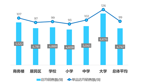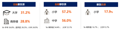 以即饮茶品类为例,尼尔森IQ研究发现,该品类在不同类型店铺中的销售表现不同,可以看到其在商务写字楼店及高等院校周边店有着更强的单品卖力。