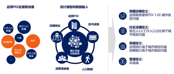 在此基础上,尼尔森IQ能够根据店铺店周的各类数据及消费者画像,通过潜在类别分析模型,进一步划定特征较明显的店组。以某食品品类为例,我们基于店周POI和消费者画像等因素,进一步划分出高端商圈店/普通商圈店/高端社区店/普通社区店四类店铺,帮助厂商更精确细致地了解需要重点关注的店铺类型及其对应的消费者特征。