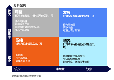 尼尔森IQ通过对产品组合的四象限分析来帮助厂商品类或单品组合的现状。基于对销售率和净增量的横纵向对比,我们将产品划分为调整、发展、压缩和培养四个象限。对于调整和压缩区域,有针对性地调整单品组合计划,而对于处于发展或者培养区域的单品,则适当地增加铺货或提供营销支持。