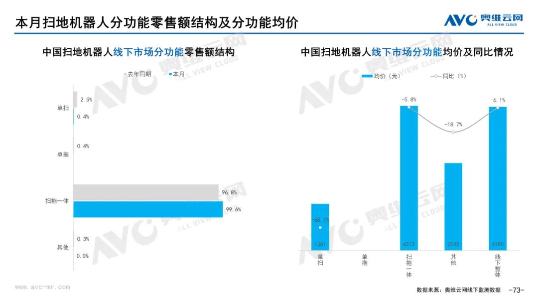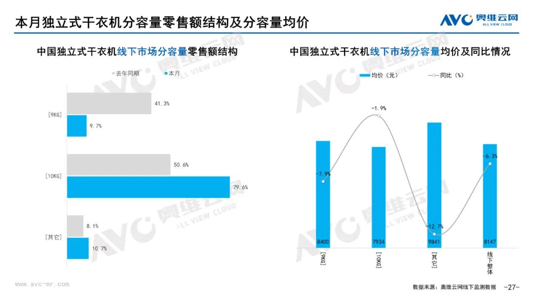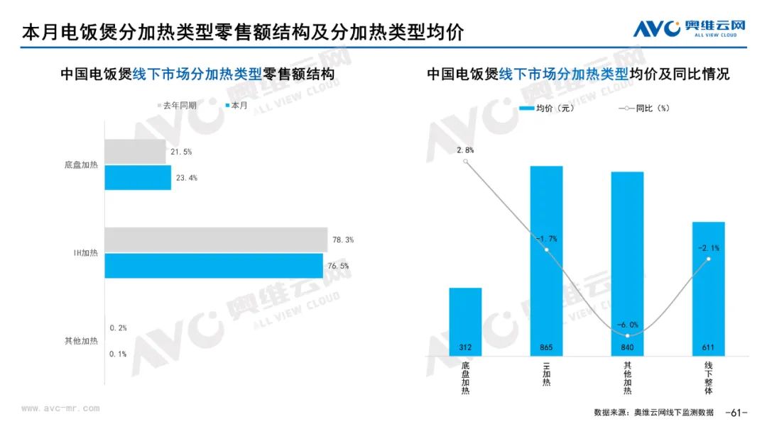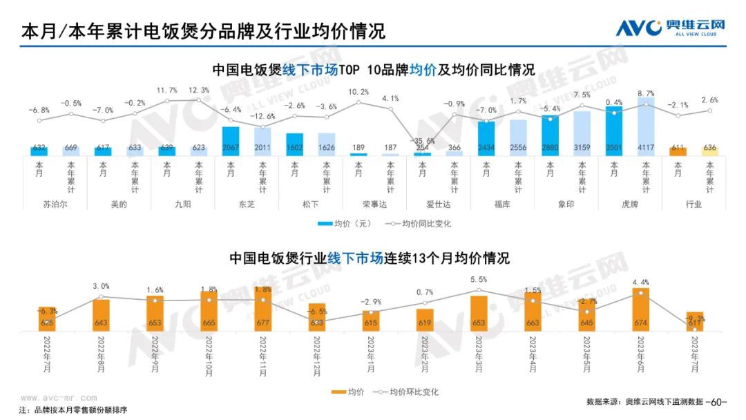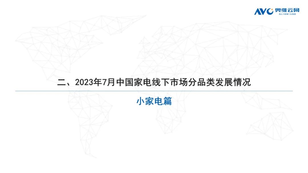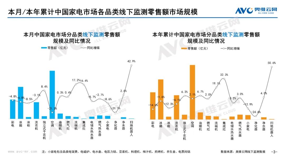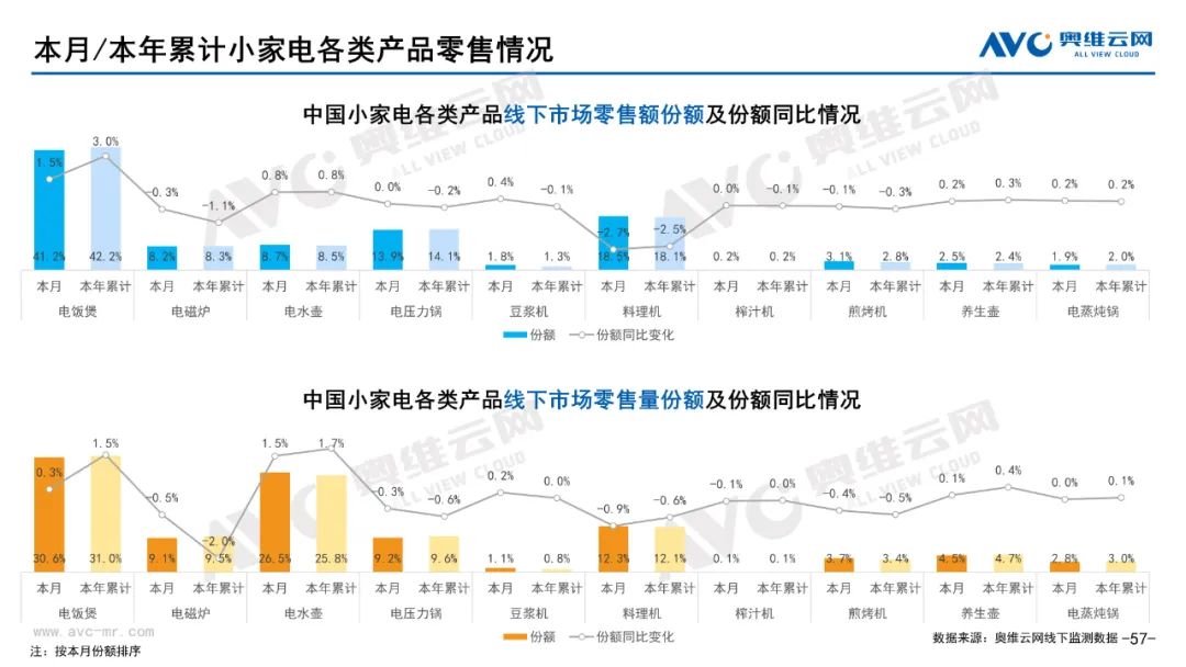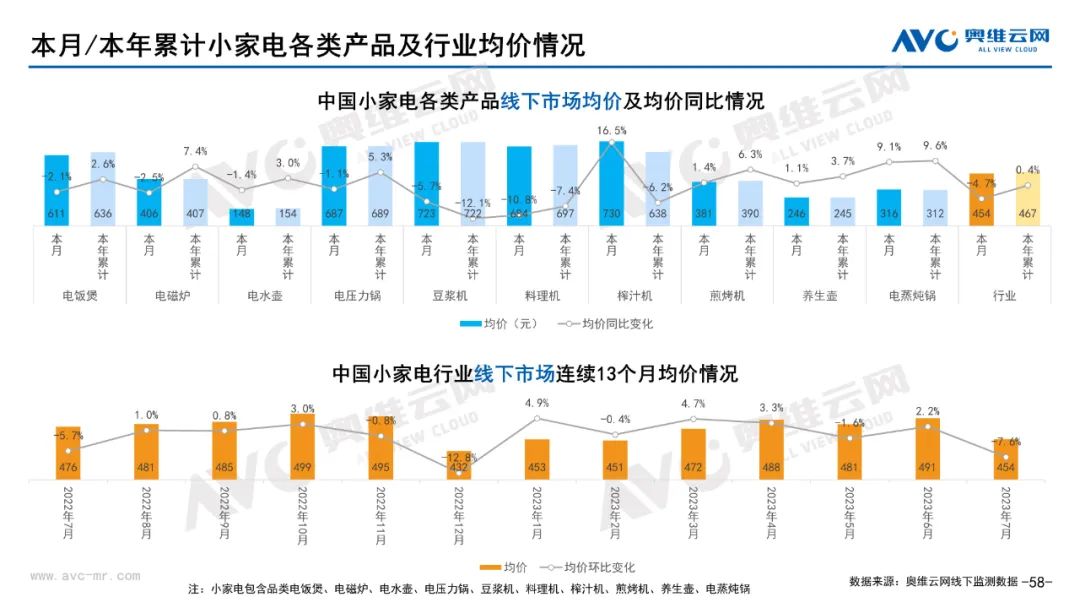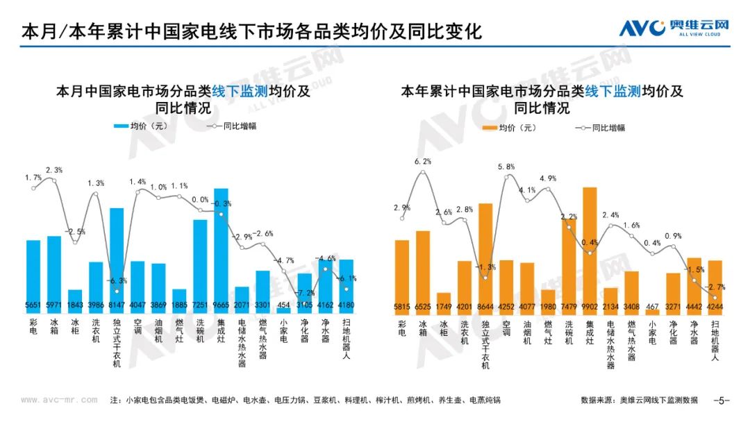 小家电:据奥维云网(AVC)线下市场监测数据显示,本月小家电线下零售额规模同比-8.6%;均价为454元,同比-4.7%;高端品零售额占比5.4%,同比-1.1%。