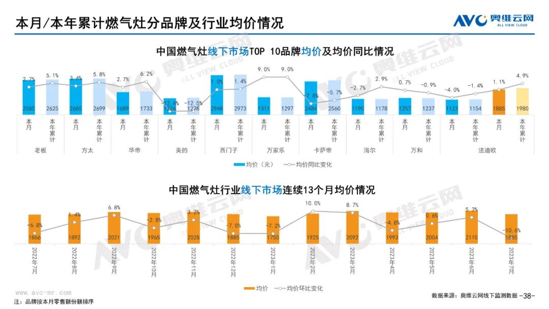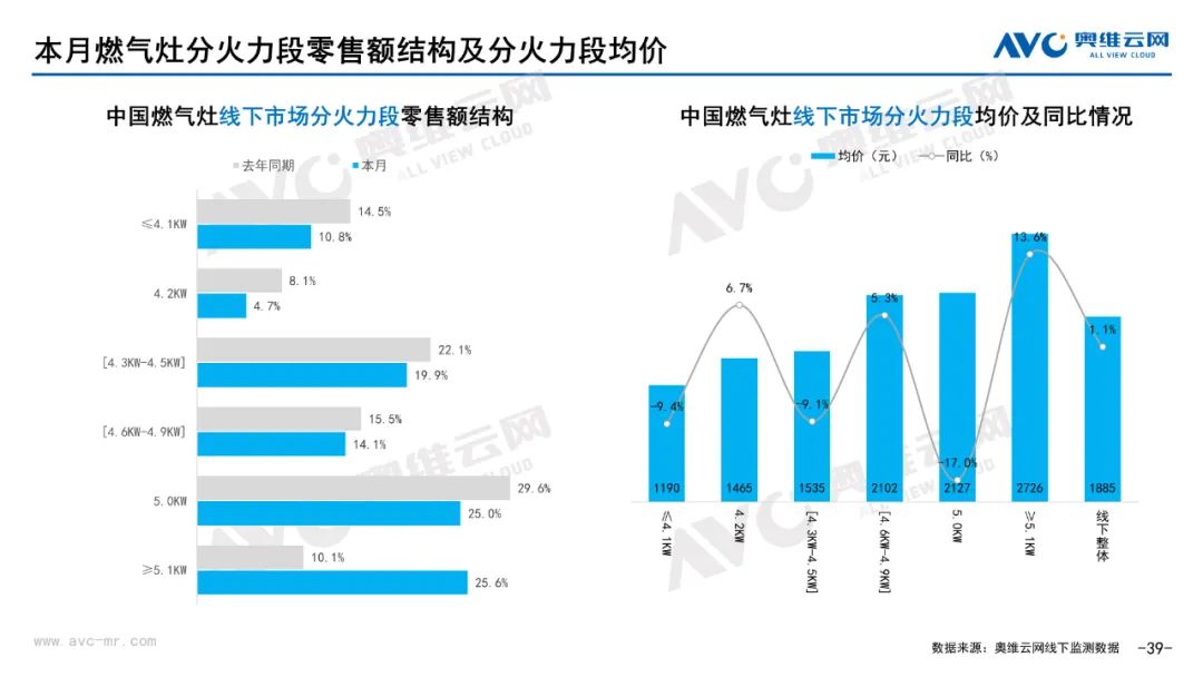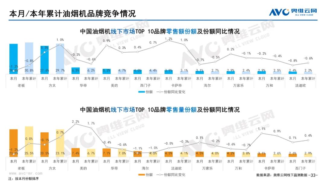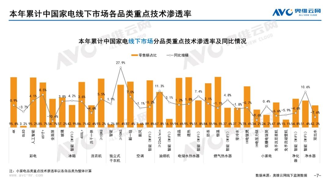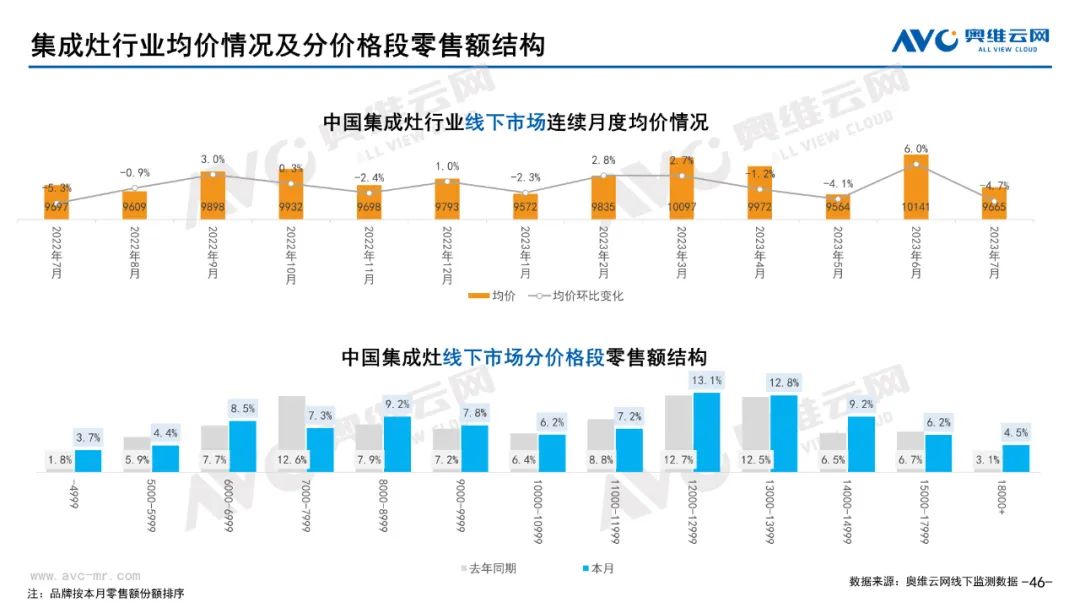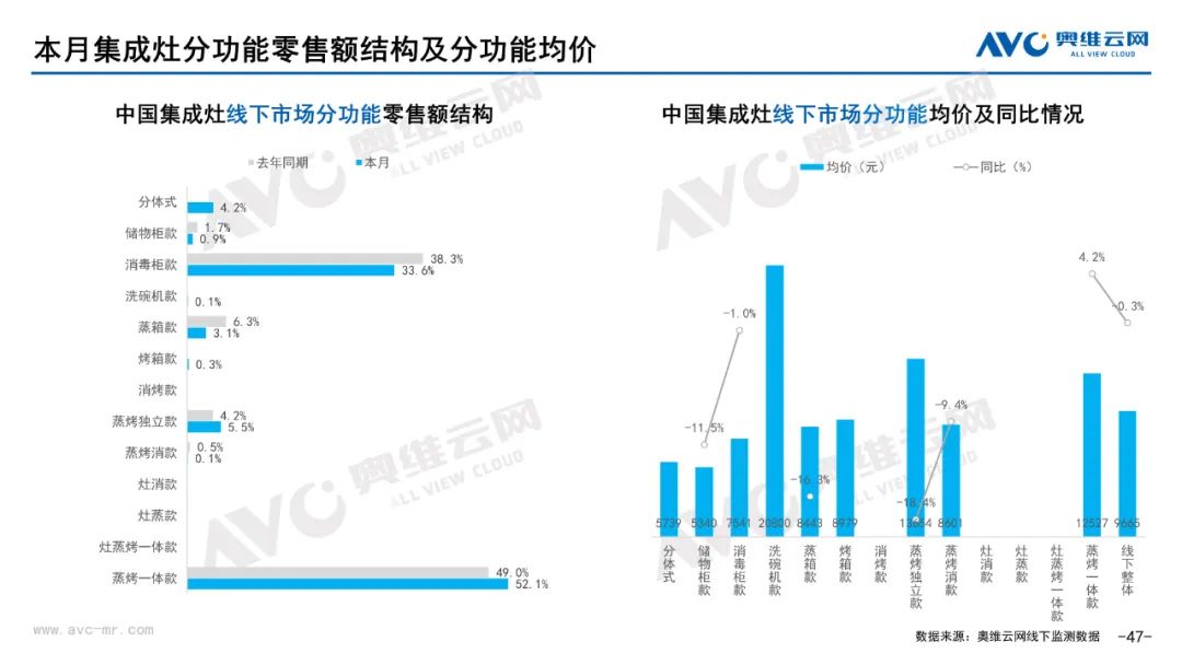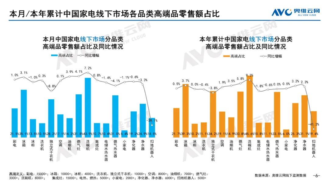 厨卫:据奥维云网(AVC)线下市场监测数据显示,本月厨卫主要品类中,油烟机、燃气灶、洗碗机、集成灶、电热和燃热的线下零售额规模同比分别为0.3%、0.4%、17.2%、16.4%、-5.7%和-2.7%;油烟机、燃气灶、洗碗机、集成灶、电热和燃热的均价分别为3869元、1885元、7251元、9665元、2071元和3301元,同比分别为1.0%、1.1%、0.0%、-0.3%、-2.9%和-2.6%;各品类中,高端品零售额占比分别为14.2%、31.8%、43.9%、10.7%、10.4%和31.0%,同比分别为3.9%、4.1%、7.2%、0.8%、-1.4%和-4.1%。