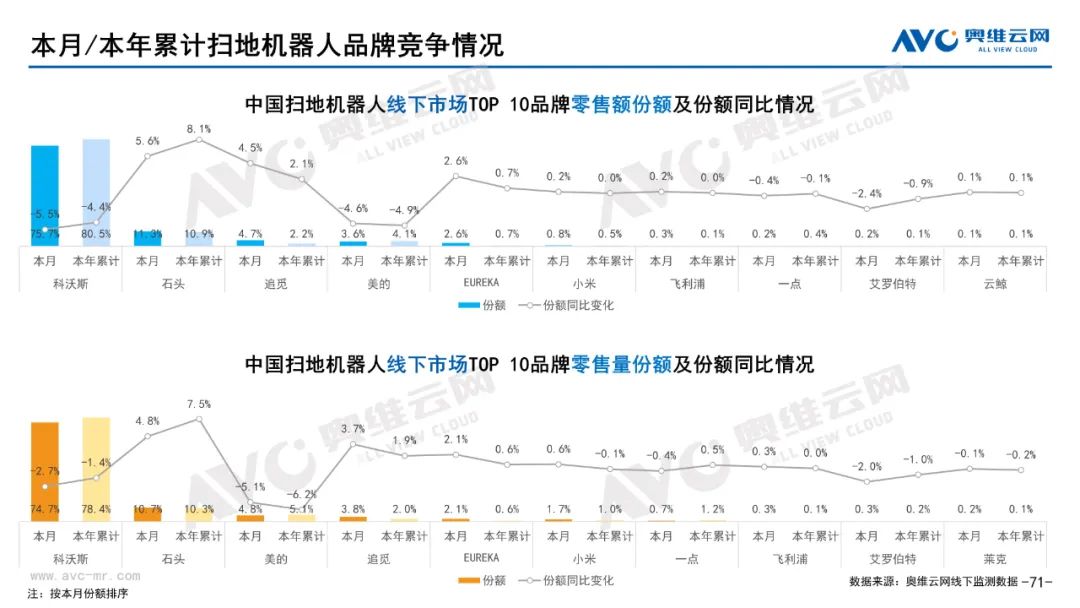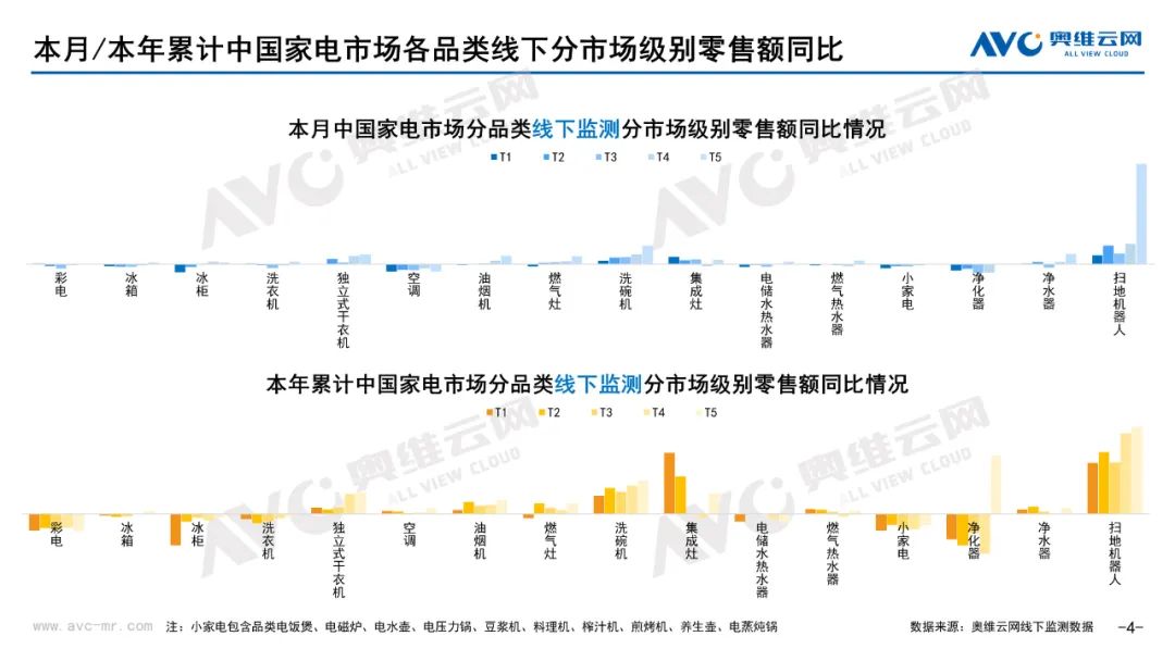 环电:据奥维云网(AVC)线下市场监测数据显示,本月环电主要品类中,净化器、净水器和扫地机器人线下零售额规模同比分别为-21.1%、2.6%和42.9%;净化器、净水器和扫地机器人的均价分为3105元、4162元和4180元,同比分别为-7.2%、-4.6%和-6.1%;各品类中,高端品零售额占比分别为19.2%、24.9%和14.5%,同比分别为-0.6%、-3.3%和-39.1%%。