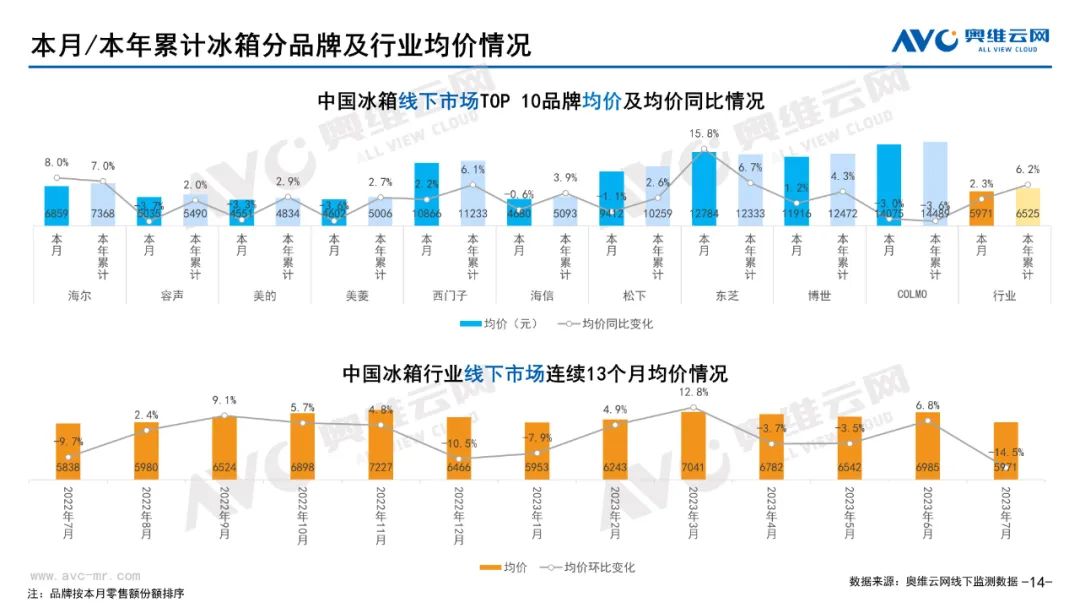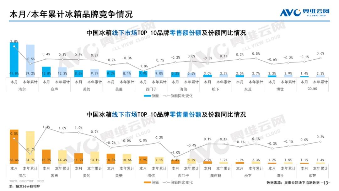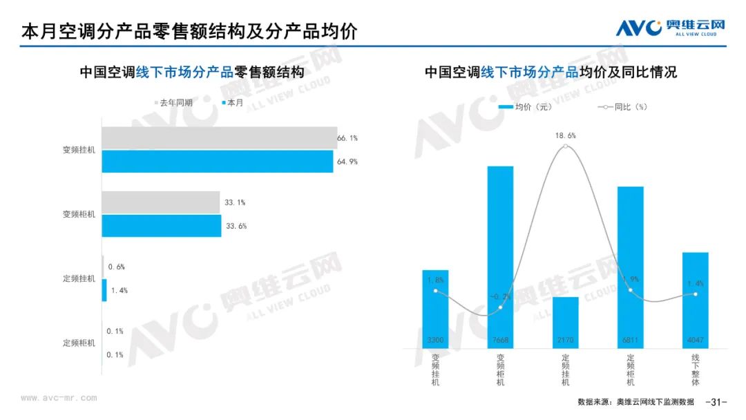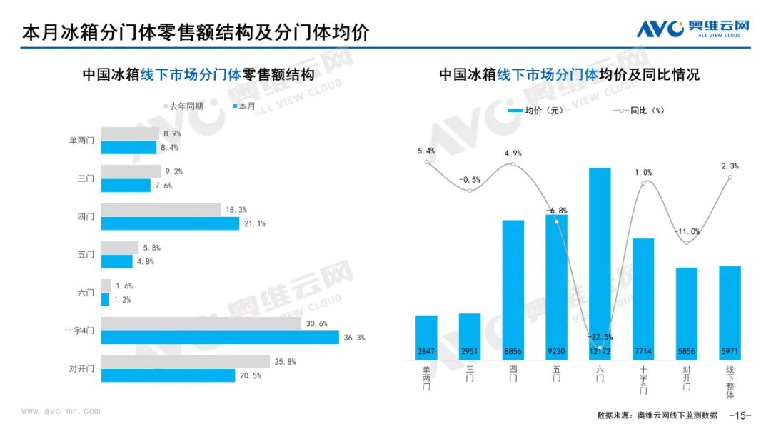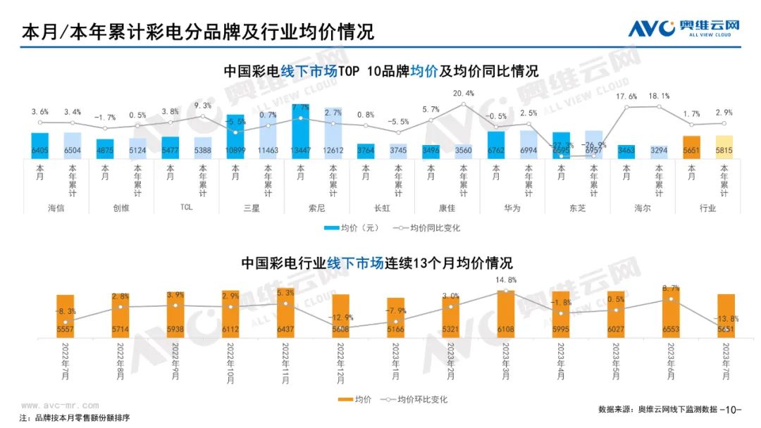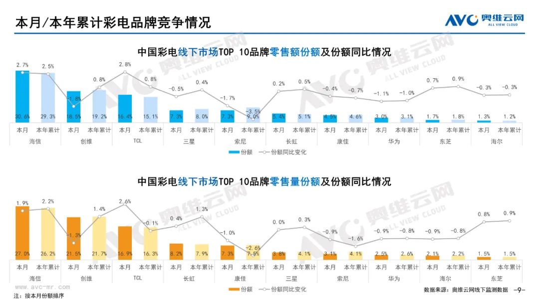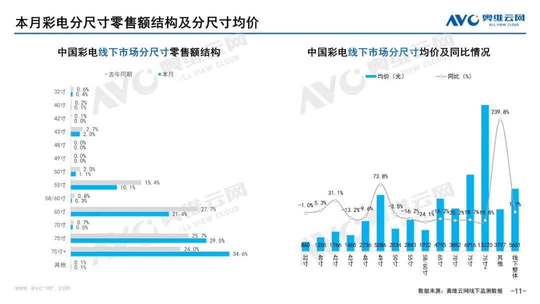 彩电:据奥维云网(AVC)线下市场监测数据显示,本月彩电线下零售额规模同比-4.8%;均价为5651元,同比1.7%;15000+的彩电零售额占比21.5%,同比1.0%;不同彩电尺寸中,75寸+彩电零售额占比34.6%,同比10.6%。