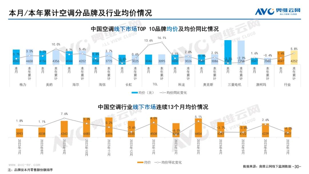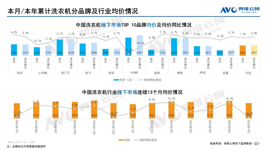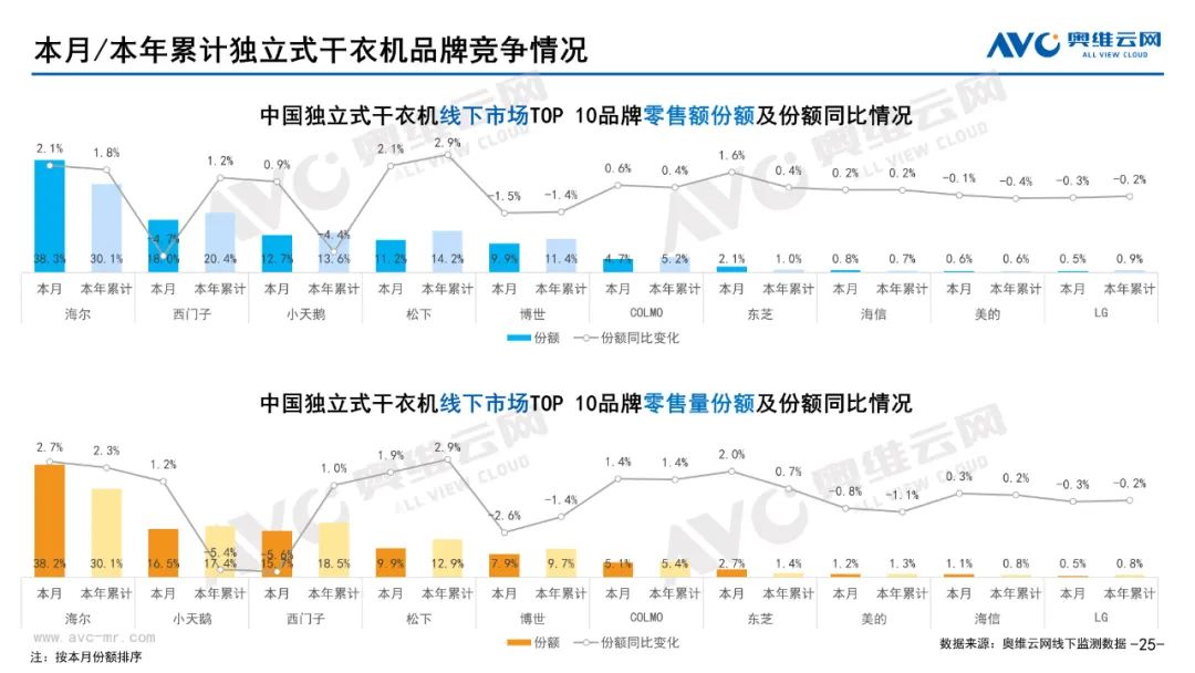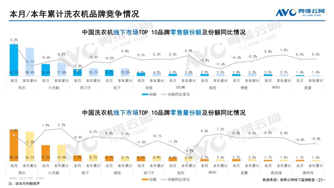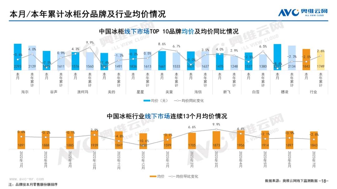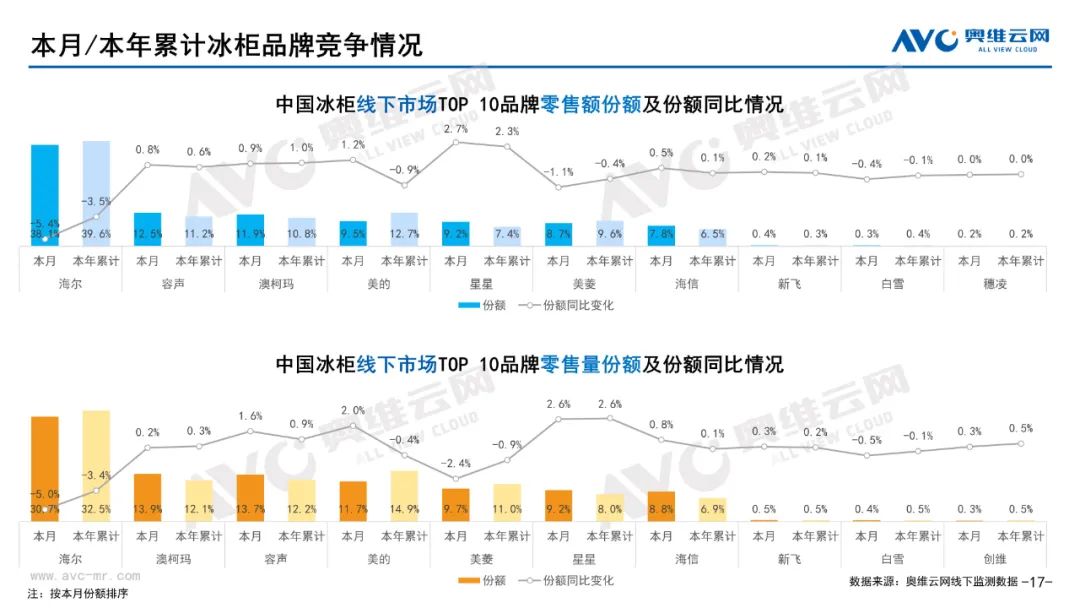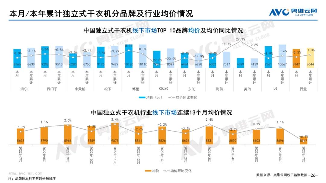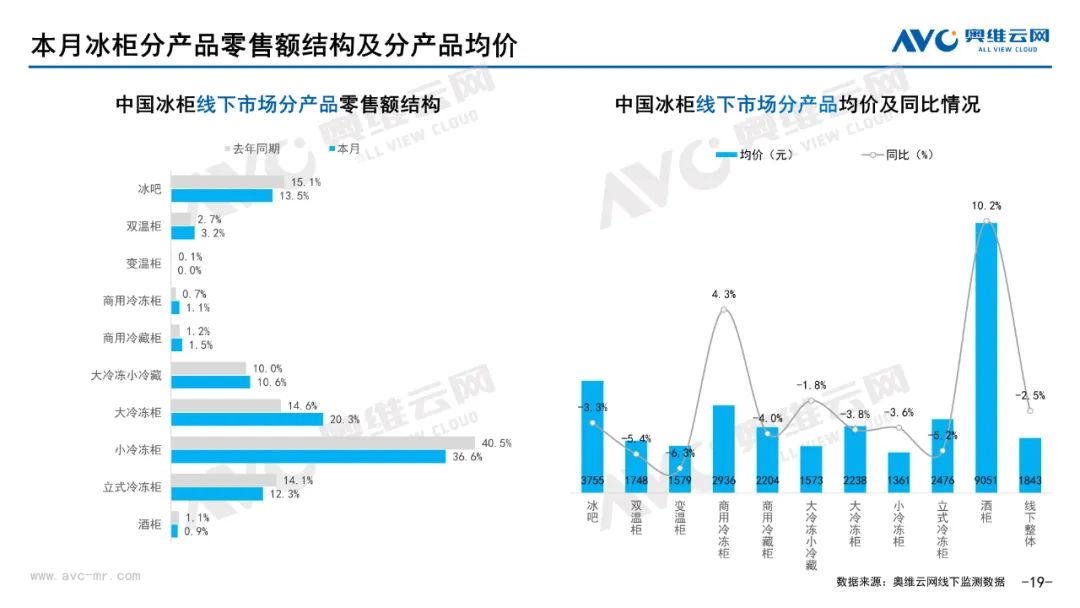 白电:据奥维云网(AVC)线下市场监测数据显示,本月白电各品类中,冰箱、冰柜、洗衣机、独立式干衣机和空调线下零售额规模同比分别为-6.8%、-8.5%、-3.1%、8.4%和-21.3%;冰箱、冰柜、洗衣机、独立式干衣机和空调的均价分别为5971元、1843元、3986元、8147元和4047元,同比分别为2.3%、-2.5%、1.3%、-6.3%和1.4%;各品类中,高端品零售额占比分别为35.1%、13.5%、10.5%、28.2%和17.1%,同比分别为3.1%、-1.0%、0.3%、-8.8%和0.1%。
