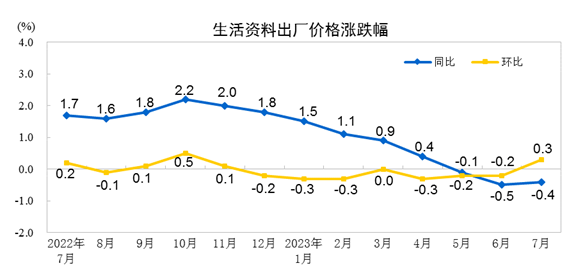 2023年7月份,全国工业生产者出厂价格同比下降4.4%,环比下降0.2%;工业生产者购进价格同比下降6.1%,环比下降0.5%。1—7月平均,工业生产者出厂价格比上年同期下降3.2%,工业生产者购进价格下降3.5%。