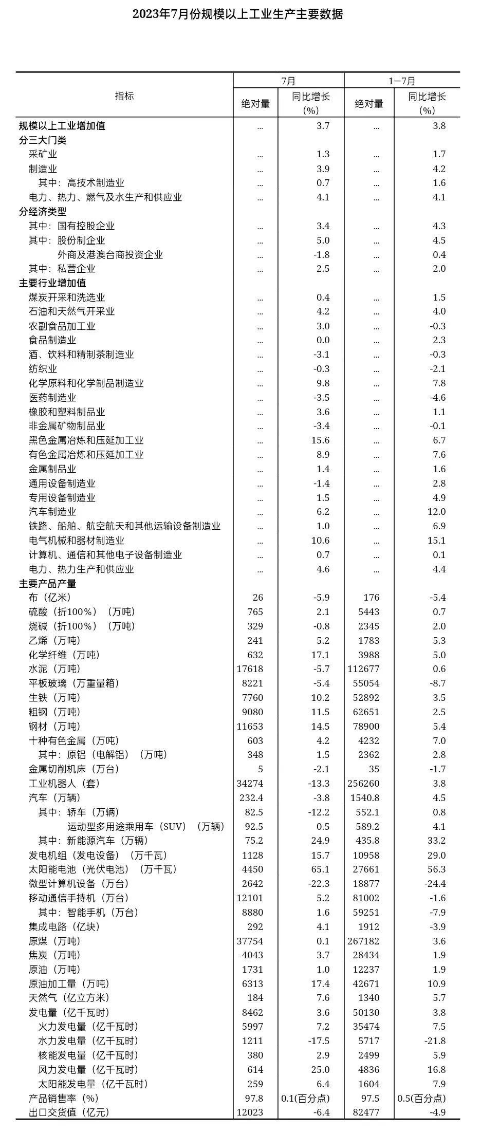 分产品看,7月份,620种产品中有303种产品产量同比增长。钢材11653万吨,同比增长14.5%;水泥17618万吨,下降5.7%;十种有色金属603万吨,增长4.2%;乙烯241万吨,增长5.2%;汽车232.4 万辆,下降3.8%,其中新能源汽车75.2万辆,增长24.9%;发电量8462亿千瓦时,增长3.6%;原油加工量6313万吨,增长17.4%。