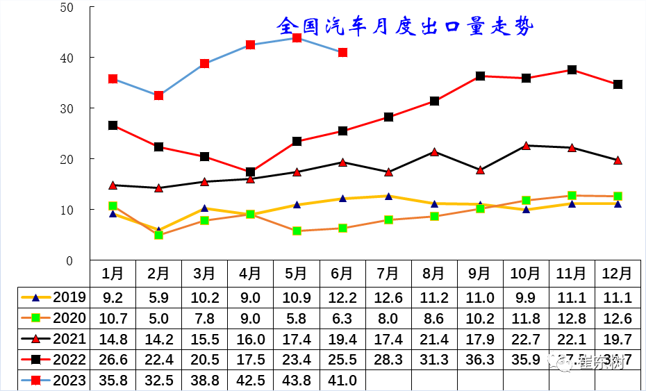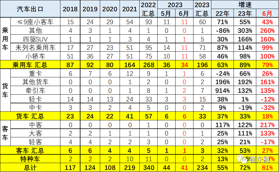 2023年6月中国汽车出口达到41万台,6月出口继续保持历史高位的走势。由于2022年的上海恢复带来的高基数,今年6月的出口增长超过61%,因此中国汽车出口暴增的局面已经持续出现。