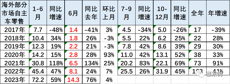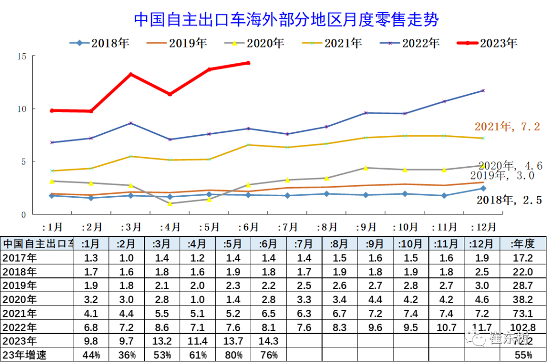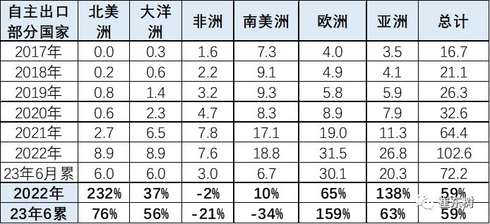 因为出口汽车有部分是合资车企车型,有部分是商用车,统计很难完整,因此我们只统计主流地区的自主车型销量。从海外70个国家的月度的当地销量统计数据来看,2023年1-6月份中国自主品牌车出口在当地市场销售达到72万台的水平,同比增长59%的表现相对较强;6月自主车出口的海外零售达到14.3万台,同比增长76%,呈现强势良好增长的态势。