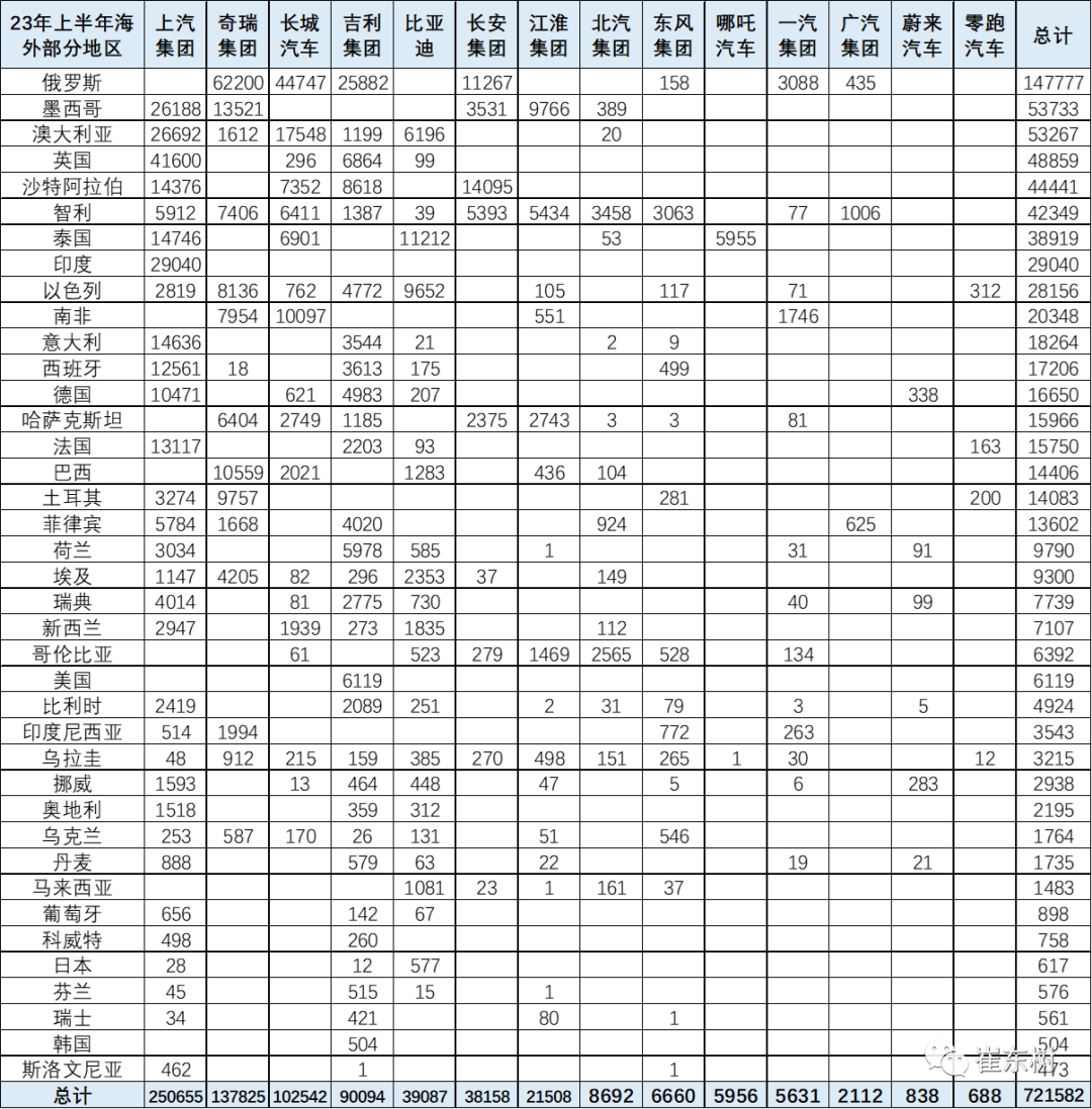 而奇瑞汽车在智利市场、俄罗斯市场和埃及市场表现都极其的优秀。长城汽车在俄罗斯市场和南非市场以及部分其他市场表现都也是极其良好的态势。
