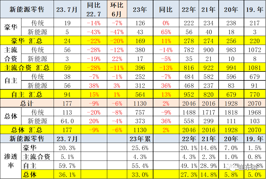 7月,自主品牌中的新能源车渗透率59.7%;豪华车中的新能源车渗透率20.3%;而主流合资品牌中的新能源车渗透率仅有5.1%。