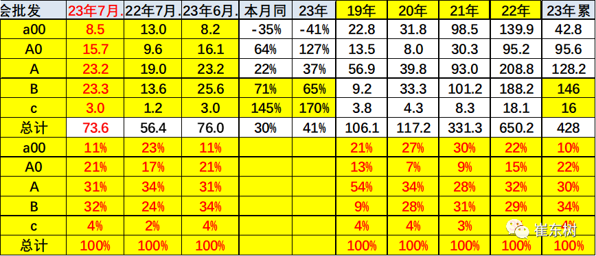 7月B级电动车销量14.5万辆,同比增长69%,环比下降11%,占纯电动份额29%。纯电动市场的A00+A0级经济型电动车市场崛起,其中A00级批发销量8.5万辆,同比下降35%,环比增长3%,占纯电动的17%份额,份额同比下降13个百分点;A0级批发销量15.6万辆,占纯电动的32%份额,同比增加10个百分点;A级电动车9.5万,占纯电动份额19%;各级别电动车销量相对分化。