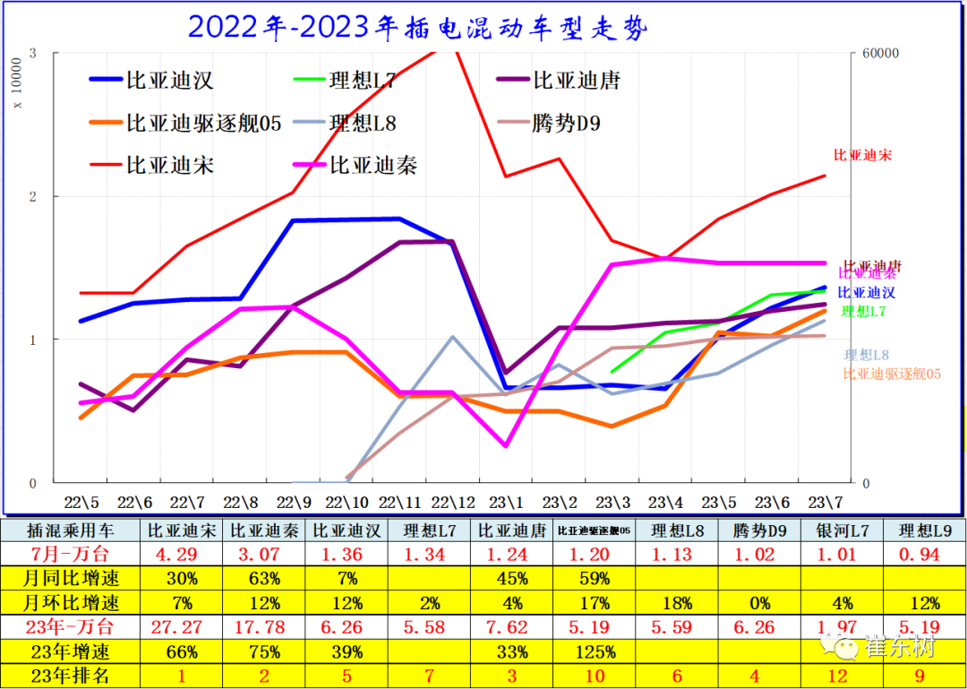 2023年7月份插电混动市场走势分化,主要的厂家是比亚迪处于绝对领先,比亚迪由于销量较高,放到右轴。理想汽车、长城、长安汽车、吉利汽车等跟进比亚迪发展插混,但差距较大。近期吉利和长城新品的插混产品很有竞争力。