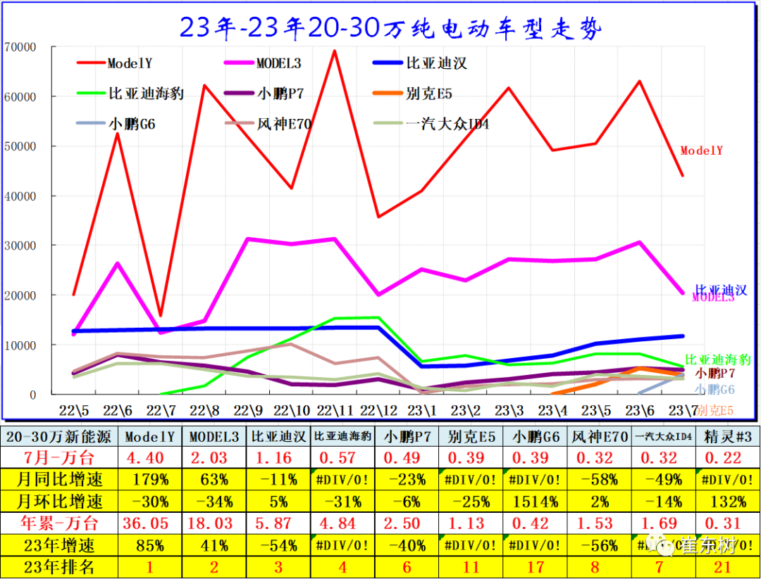 20-30万元市场纯电动车型,主力车型仍然是Model Y、Model3,还有比亚迪汉、极氪001等车型,尤其是Model Y销量(含出口)7月份走势较强,同比也是正增长状态。未来来看,Model Y的销量仍然是在20-30万区间绝对领军的车型。高端的比亚迪汉的销量也是压力不大的走势特征,但像小鹏P7等的表现也是仍需努力。