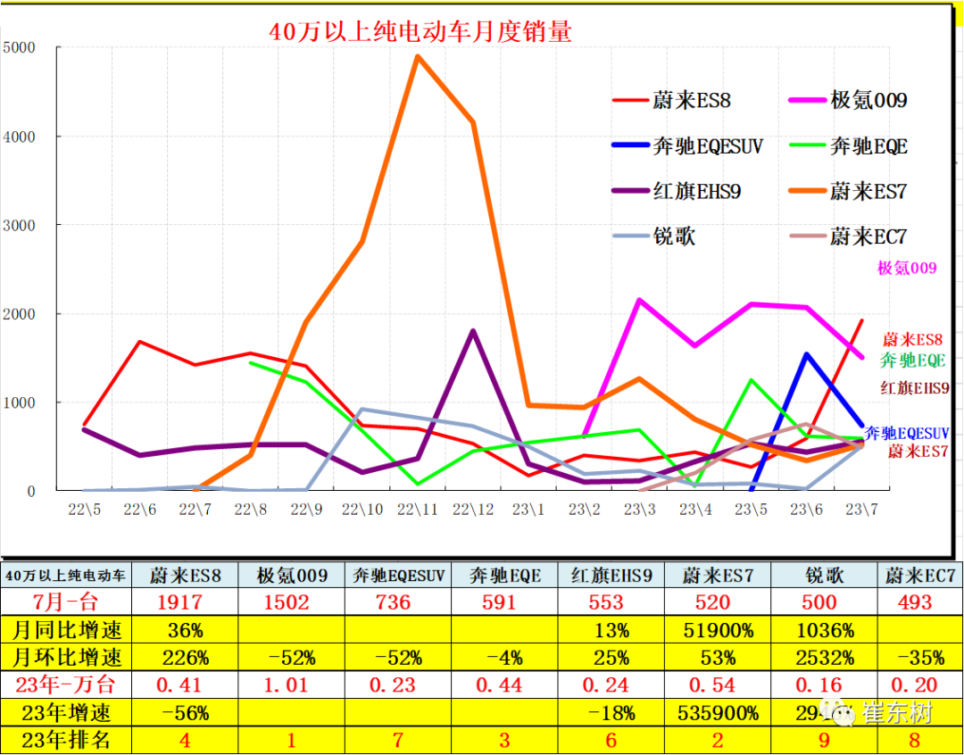 40万元以上的纯电动市场,近期销量不断走强。领军车型主要是蔚来ES8、蔚来ES7、蔚来ET7、奔驰EQE、红旗EHS9以及奔驰和凯迪拉克锐歌等车型相对应的组成,近期40万以上车型总体较稳,蔚来ES8、蔚来ES7、蔚来ET7、奔驰EQE和红旗EHS9、凯迪拉克锐歌上市后起步表现不错。