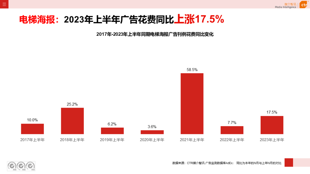 ● CTR数据显示,电梯LCD和电梯海报花费涨幅分别为19.9%和17.5%;影院视频、火车/高铁站、机场和地铁广告花费同比变化均由负转正;街道设施广告同比虽然减少2.0%,但较去年同期收窄34个百分点。