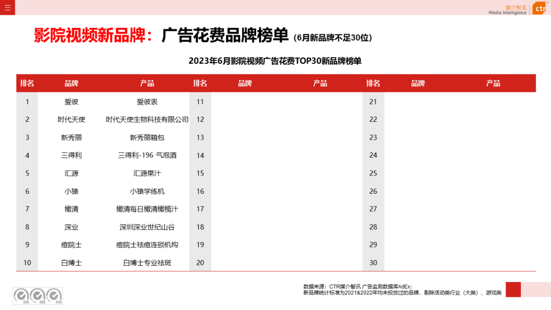 ● 2023年6月新品牌方面,电梯海报的前30个新品牌有四成来自IT产品及办公自动化服务、商业及服务性行业;房地产/建筑工程行业、娱乐及休闲、商服的新品牌占到街道设施广告新品牌半数席位。地铁的新品牌以商服、娱乐及休闲行业的占比较大;其他户外广告渠道的新品牌数量都不足30个。 电梯LCD四成的新品牌来自饮料和食品行业。影院视频的新品牌以个人用品、饮料和商服行业的居多。食品、工业用品行业占到火车/高铁站的新品牌三成席位。机场的新品牌以酒精类饮品、食品和个人用品行业为主。