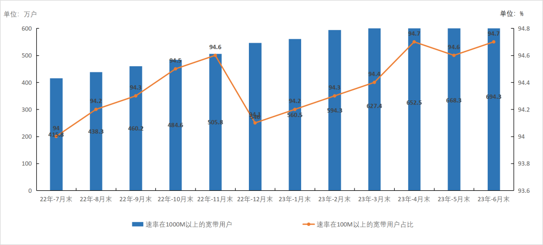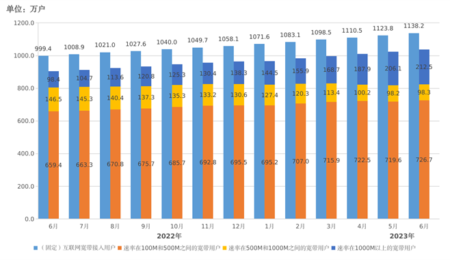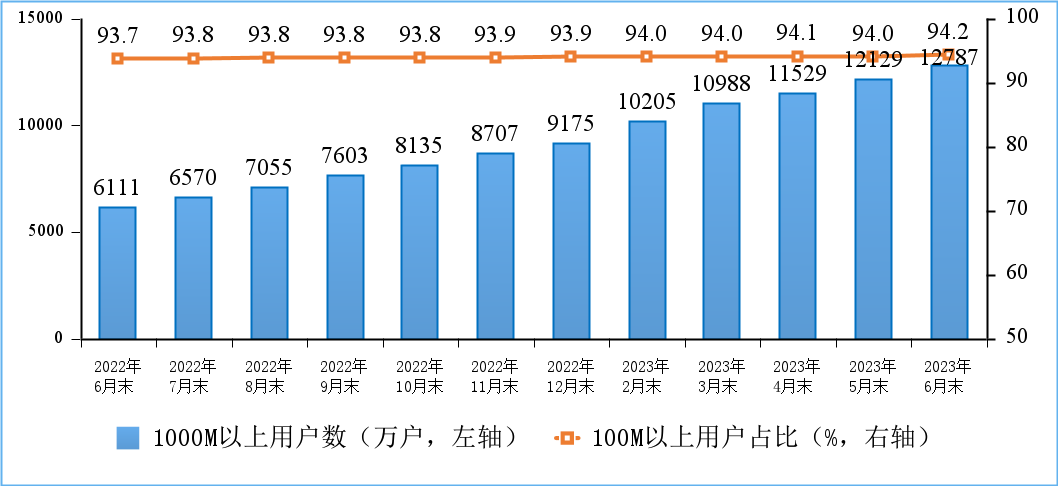 固定宽带接入用户数稳步增加,千兆用户占比超两成。截至6月末,三家基础电信企业的固定互联网宽带接入用户总数达6.14亿户,比上年末净增2468万户。其中,100Mbps及以上接入速率的固定互联网宽带接入用户达5.79亿户,占总用户数的94.2%,占比较上年末提升0.3个百分点;1000Mbps及以上接入速率的固定互联网宽带接入用户达1.28亿户,比上年末净增3612万户,占总用户数的20.8%。
