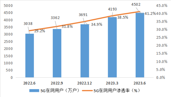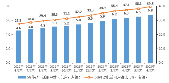 移动电话用户稳中有增,5G用户规模加速扩大。截至6月末,三家基础电信企业的移动电话用户总数达17.1亿户,比上年末净增2653万户。其中,5G移动电话用户达6.76亿户,比上年末净增1.15亿户,占移动电话用户的39.5%,占比较上年末提高6.2个百分点。