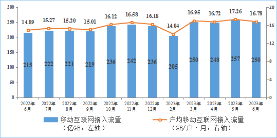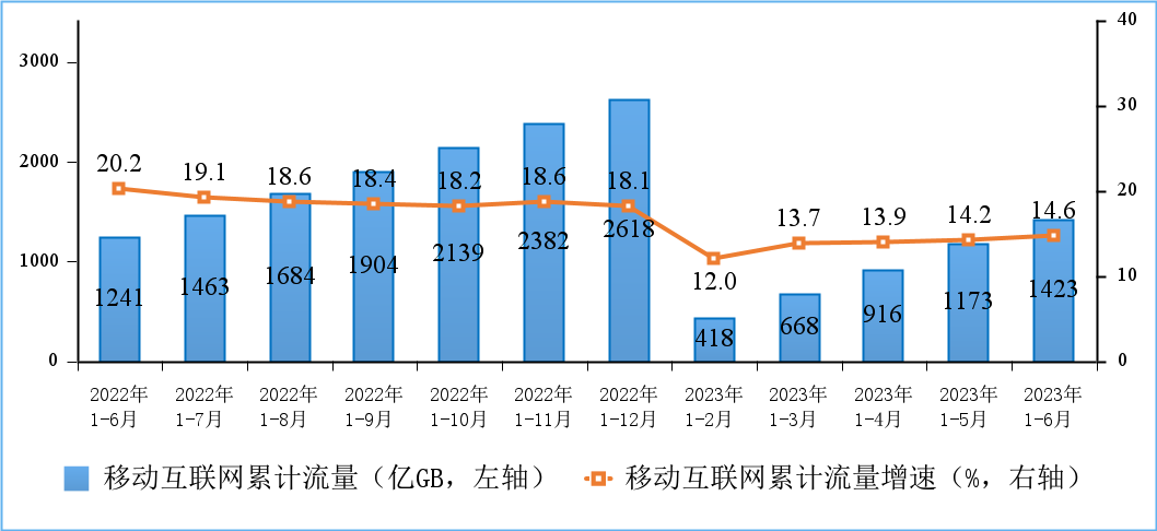 2023年1-6月,全省固定互联网累计流量达255.4亿GB,同比增长3.7%。全省移动互联网累计流量达31.7亿GB,同比增长11.3%。