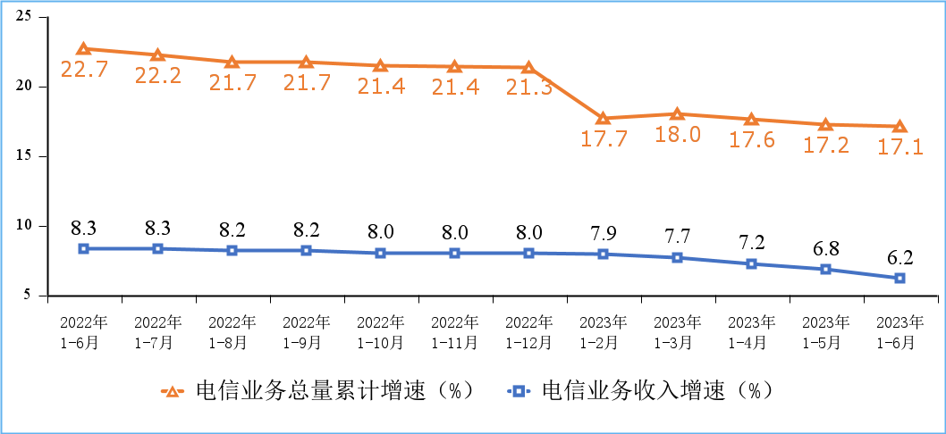 电信业务收入平稳增长,电信业务总量持续较好增势。上半年,电信业务收入累计完成8688亿元,同比增长6.2%。按照上年不变价计算的电信业务总量同比增长17.1%。