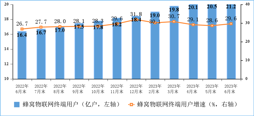 蜂窝物联网用户较快增长,IPTV用户稳步增加。截至6月末,三家基础电信企业发展蜂窝物联网终端用户21.2亿户,比上年末净增2.79亿户,占移动网终端连接数(包括移动电话用户和蜂窝物联网终端用户)的比重达55.4%。IPTV(网络电视)总用户数达3.92亿户,比上年末净增1148万户。