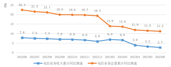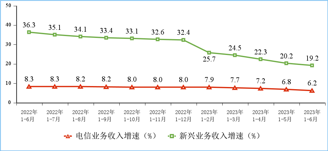 移动数据流量业务收入低速增长。上半年,三家基础电信企业完成移动数据流量业务收入3356亿元,同比增长0.2%,在电信业务收入中占比为38.6%,拉动电信业务收入增长0.1个百分点。