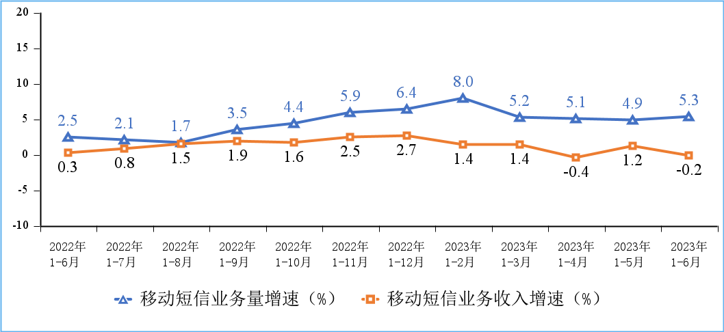 移动短信业务收入同比下降。1-6月,移动短信业务收入为21.5亿元,同比下降2.1%,移动短信业务收入在电信业务收入中占比为5.9%。