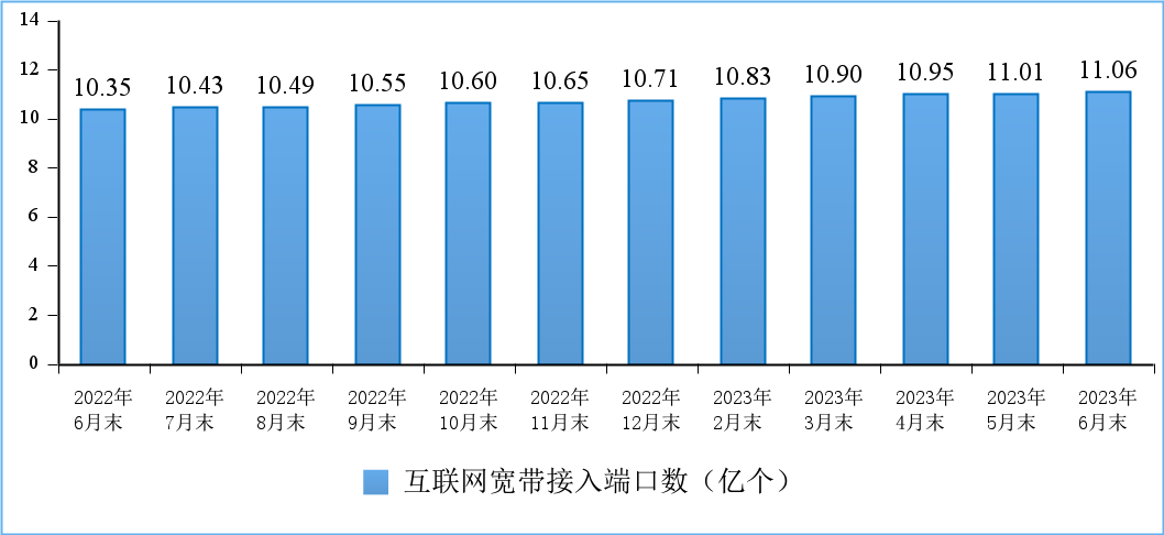 10G PON端口数超2千万。截至6月末,全国互联网宽带接入端口数量达11.1亿个,比上年末净增3457万个。其中,光纤接入(FTTH/O)端口10.6亿个,比上年末净增3855万个,占互联网宽带接入端口的96.2%。截至6月末,具备千兆网络服务能力的10G PON端口数达2029万个,比上年末净增506.5万个。