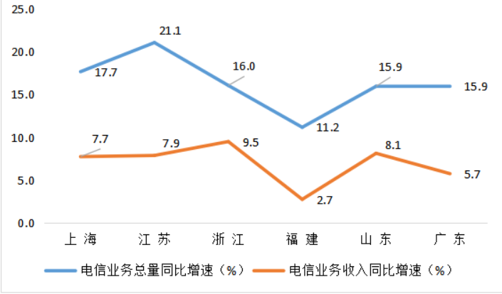 电信业务收入、总量保持较快增长。上半年,全省电信业务收入完成602.9亿元,同比增长9.5%,增速居全国第一;按照上年不变价计算的电信业务总量为573.9亿元,同比增长16%,电信业务总量与电信业务收入列全国第三,仅次于广东、江苏。