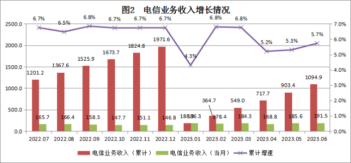 2023年1-6月,累计完成电信业务总量200.7亿元,同比增长15.8%。累计完成电信业务收入224.6亿元,同比增长3.98%,其中互联网宽带接入业务收入31.9亿元,同比增长1.6%,占电信业务收入比重为14.2%;移动数据流量业务收入80.7亿元,同比下降4.8%,占电信业务收入比重为35.9%。