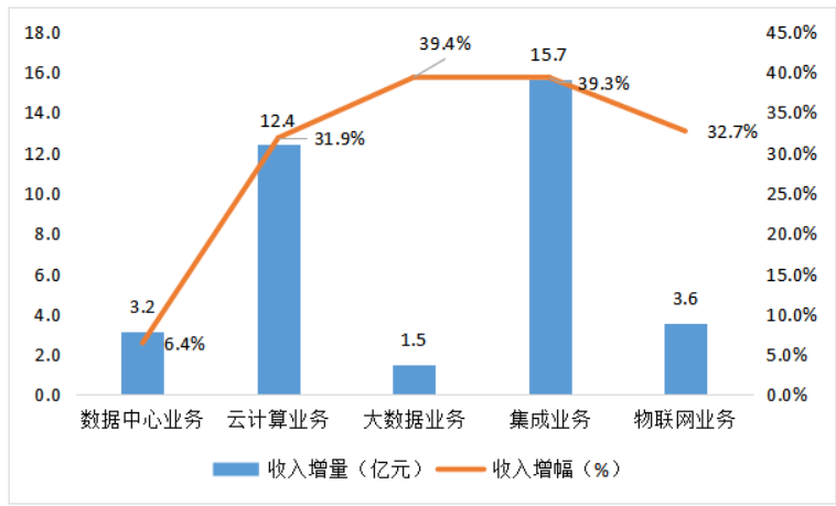 数据中心、云计算、大数据、集成业务、物联网等新业务收入为226.2亿元,同比增长10.1%,占收入份额为20.7%。